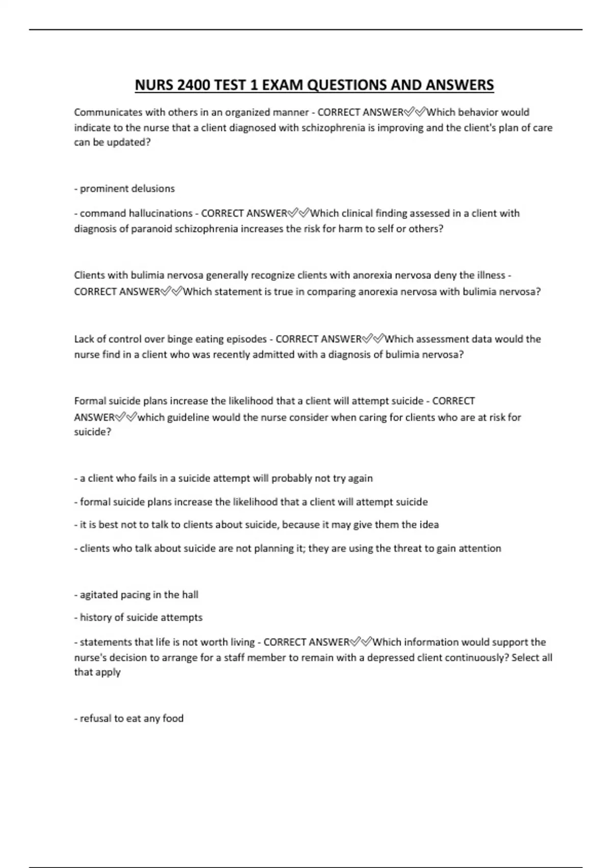 NURS 2400 TEST 1 EXAM QUESTIONS AND ANSWERS Communicates with others in an organized manner - CORRECT ANSWERWhich behavior would indicate to the nurse that a client diagnosed with schizophrenia is improving and the client's plan of care can be updated?