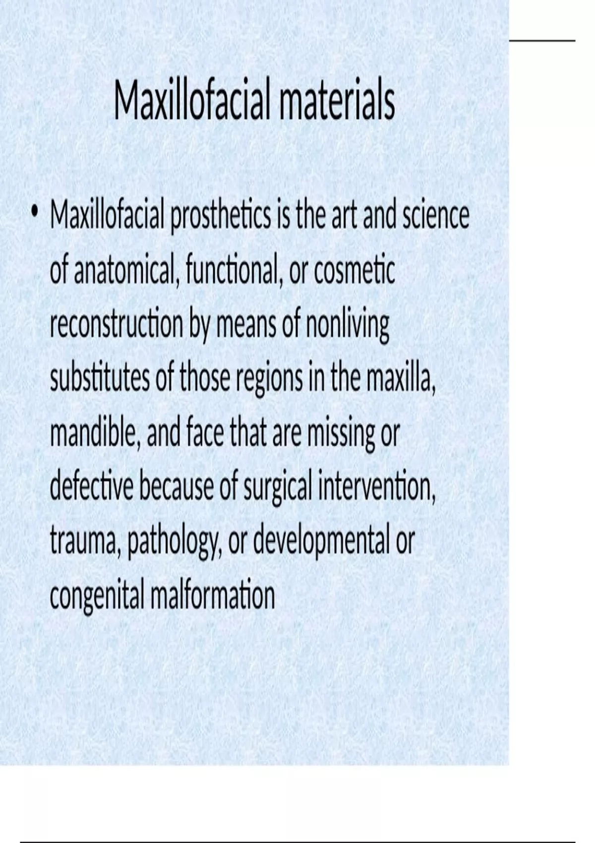 • Maxillofacial prosthetics is the art and science