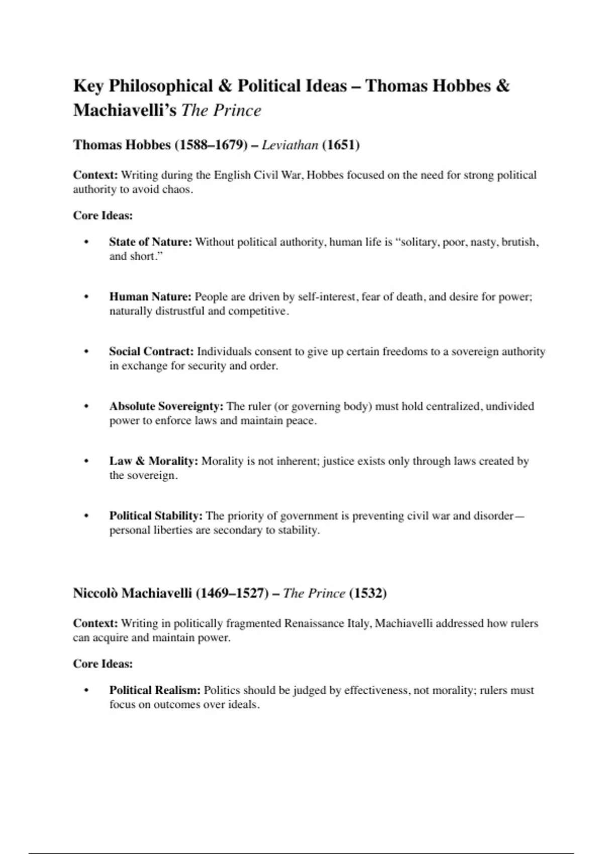 • Human Nature: People are driven by self-interest, fear of death, and desire for power;