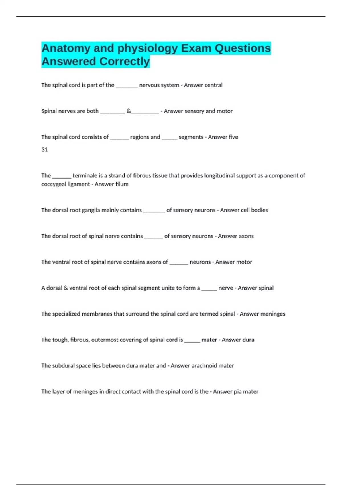 The spinal cord is part of the _______ nervous system - Answer central Spinal nerves are both ________ &_________ - Answer sensory and motor The spinal cord consists of ______ regions and _____ segments - Answer five 31 The ______ terminale is a strand of fibrous tissue that provides longitudinal support as a component of coccygeal ligament - Answer filum The dorsal root ganglia mainly contains _______ of sensory neurons - Answer cell bodies The dorsal root of spinal nerve contains ______ of sensory neurons - Answer axons The ventral root of spinal nerve contains axons of ______ neurons - Answer motor