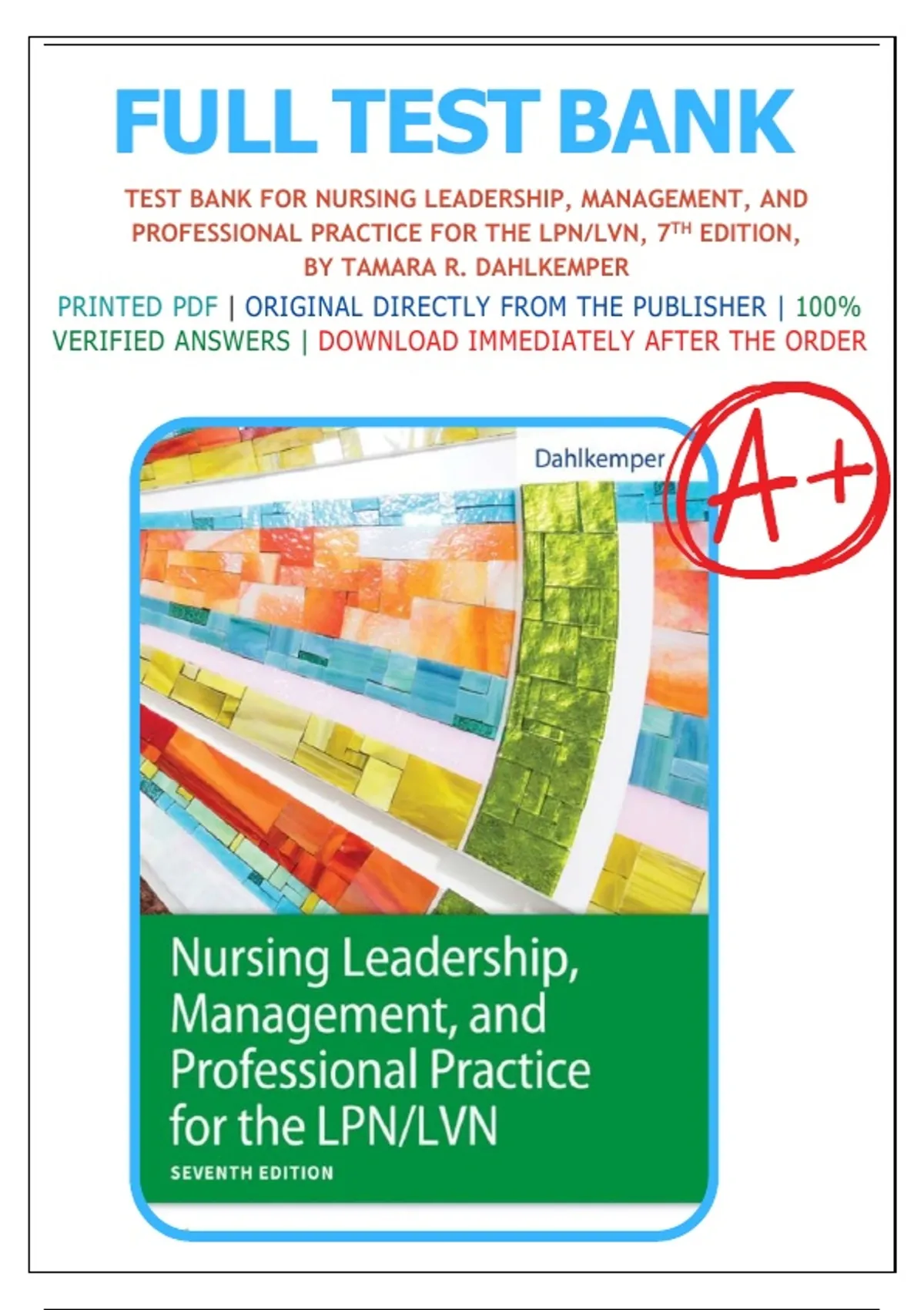 Test Bank For Nursing Leadership, Management, and Professional Practice for the LPN/LVN, 7th Edition by Tamara R. Dahlkemper, All Chapters 1-21 LATEST