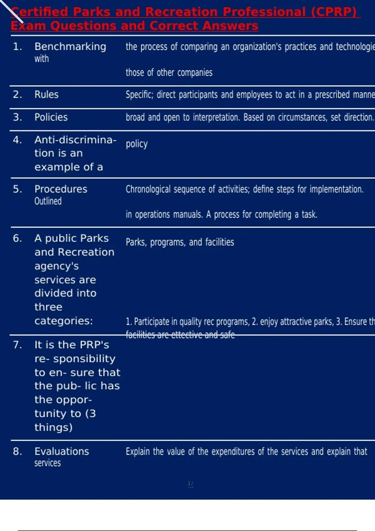 Certified Parks and Recreation Professional (CPRP) Exam Questions and Correct Answers 1. Benchmarking the process of comparing an organization's practices and technologies with those of other companies 2. Rules Specific; direct participants and employees to act in a prescribed manner 3. Policies broad and open to interpretation. Based on circumstances, set direction. 4. Anti-discrimina- tion is an example of a policy 5. Procedures Chronological sequence of activities; define steps for implementation. Outlined in operations manuals. A process for completing a task.