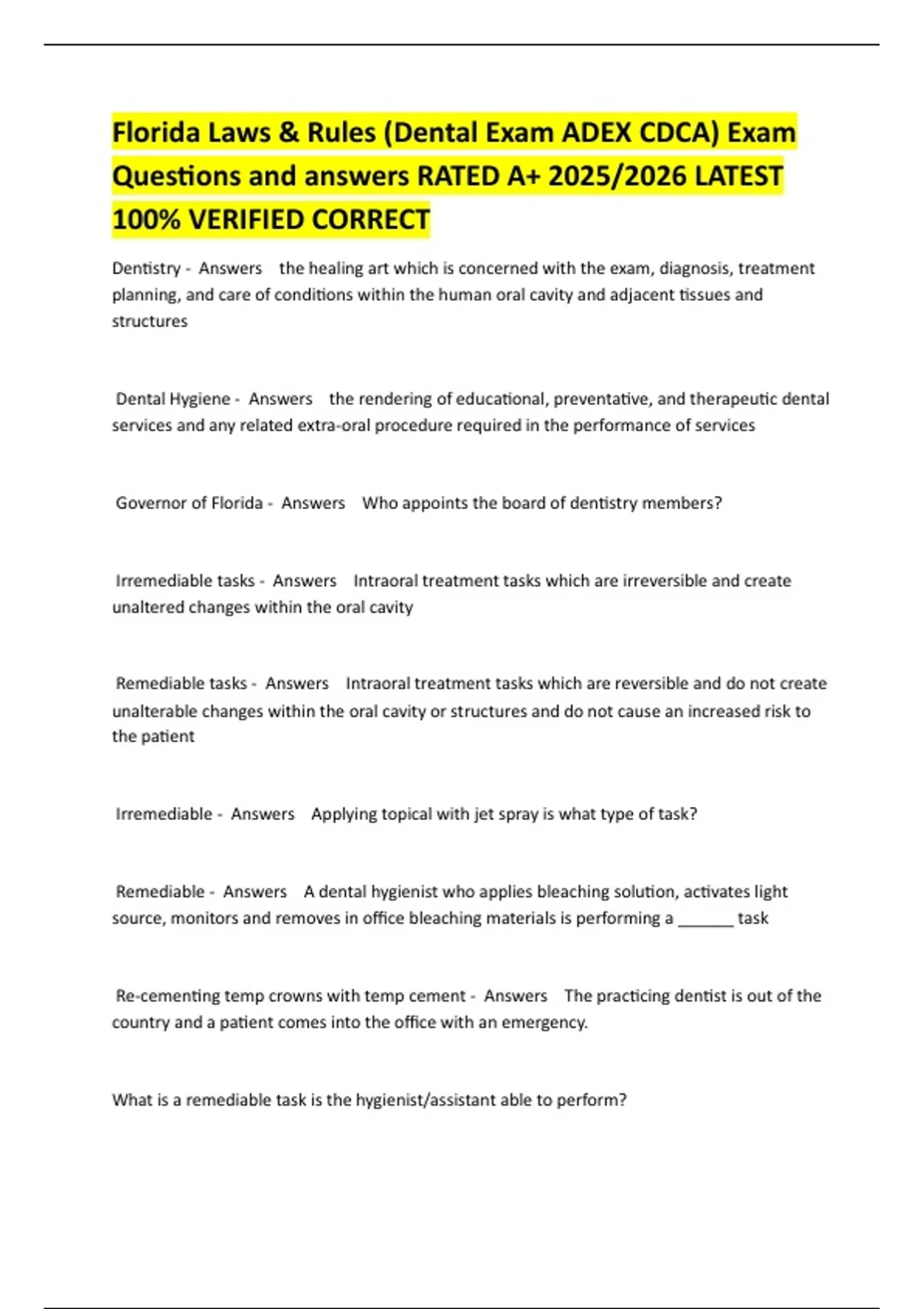 Florida Laws & Rules (Dental Exam ADEX CDCA) Exam Questions and answers RATED A+ 2025/2026 LATEST 100% VERIFIED CORRECT