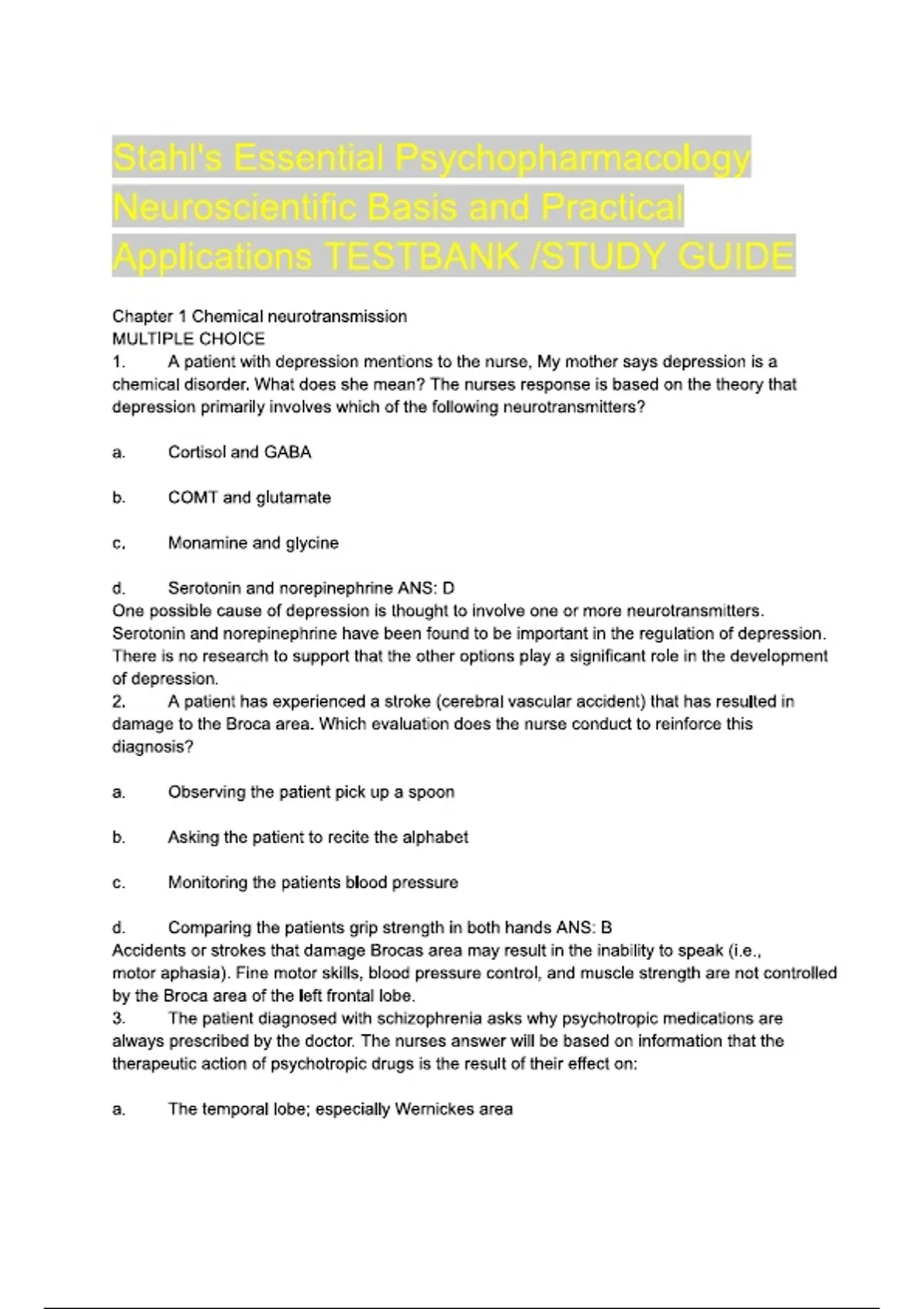 FULL TEST BANK Stahl's Essential Psychopharmacology: Neuroscientific Basis and Practical Applications 5th Edition by Stephen M. Stahl (Author) With 100% Verified Questions And Answers Graded A+.