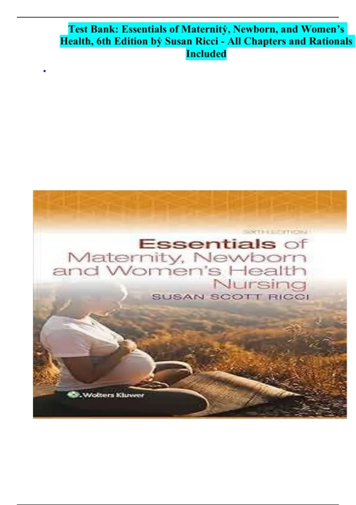 Test Bank: Essentials of Maternity, Newborn, and Women’s Health, 6th Edition by Susan Ricci - All Chapters Included With Questions And Solved Answers'