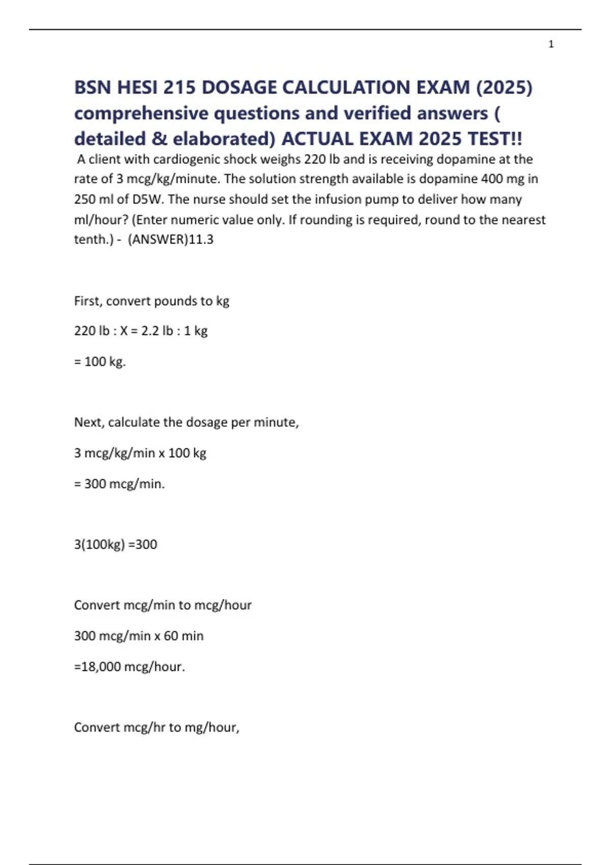 BSN HESI 215 DOSAGE CALCULATION EXAM (2025)