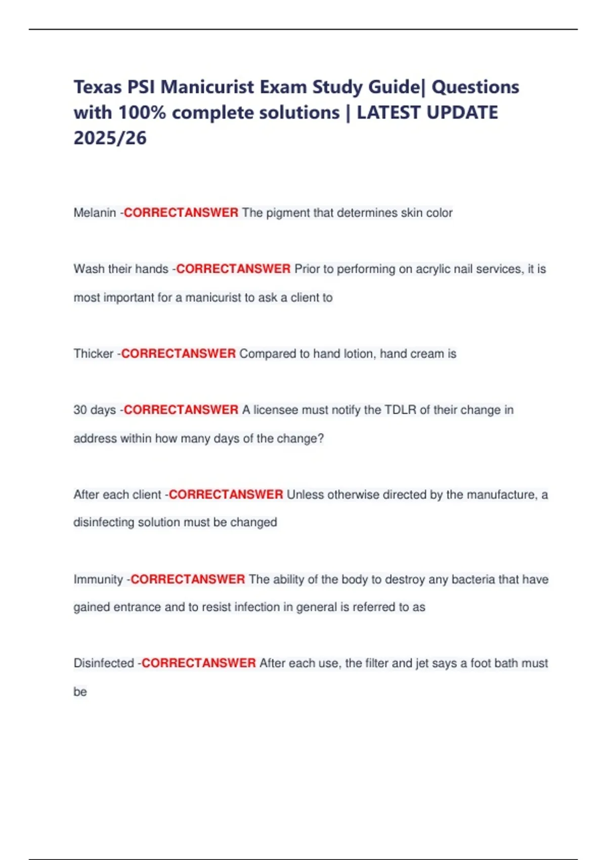 Texas PSI Manicurist Exam Study Guide| Questions with 100% complete solutions | LATEST UPDATE 2025/26