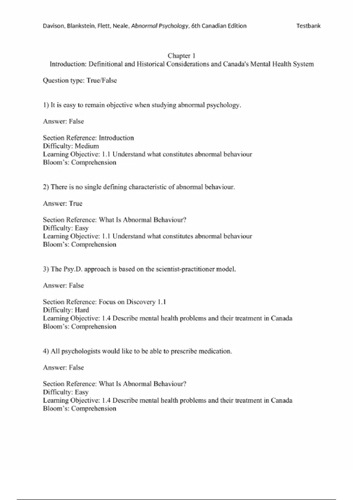 The Test Bank for Abnormal Psychology, 6th Canadian Edition by Flett, Kocovski, Davison, and Neale (ISBN 9781119335337) offers a comprehensive chapter-by-chapter collection of exam-style questions aligned to the Canadian edition's structure. It opens with Chapter 1 “Introduction, Definition and Historical Considerations, and Canada’s Mental Health System,” followed by Chapter 2 “Current Paradigms and Integrative Approaches,” Chapter 3 “Clinical Assessment, Classification, and Diagnosis,” and Chapter 4 “Research Methods in the Study of Abnormal Behaviour.” The text advances through specific disorders, beginning with Chapter 5 “Anxiety Disorders,” followed by Chapter 6 “Obsessive-Compulsive and Related Disorders (new chapter),” Chapter 7 “Somatic Symptom and Dissociative Disorders,” and Chapter 8 “Mood Disorders.” Coverage continues with Chapter 9 “Stressor-Related Disorders and Clinical Health Psychology,” Chapter 10 “Eating Disorders,” Chapter 11 “Schizophrenia,” Chapter 12 “Substance-Related Disorders,” Chapter 13 “Personality Disorders,” Chapter 14 “Sexual Dysfunctions,” Chapter 15 “Disorders of Childhood,” Chapter 16 “Aging and Psychological Disorders,” Chapter 17 “Clinical Treatment Issues and Approaches,” and Chapter 18 “Legal Issues in Psychological Intervention.” Each chapter in the Test Bank includes multiple-choice, true/false, matching, and clinical scenario questions tailored to enhance students’ understanding of the complexities of psychopathology, assessment methods, treatment frameworks, and legal considerations in the Canadian context.