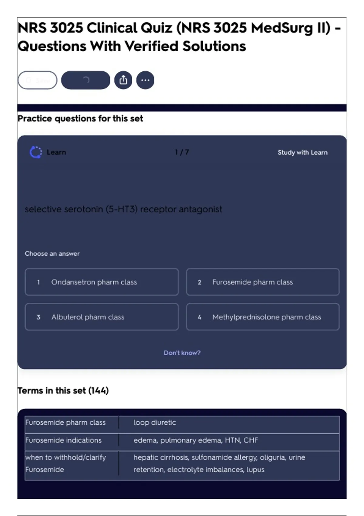 1 Ondansetron pharm class 2 Furosemide pharm class