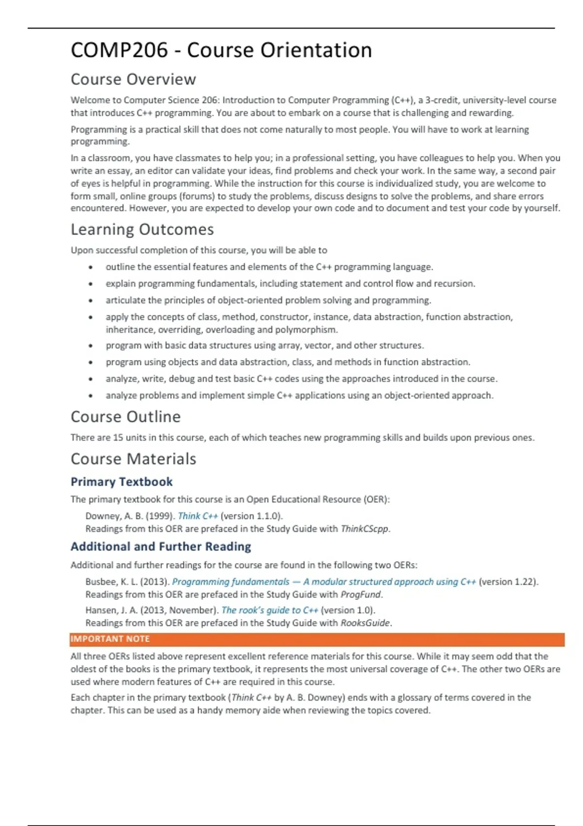 Welcome to Computer Science 206: Introduction to Computer Programming (C++), a 3-credit, university-level course