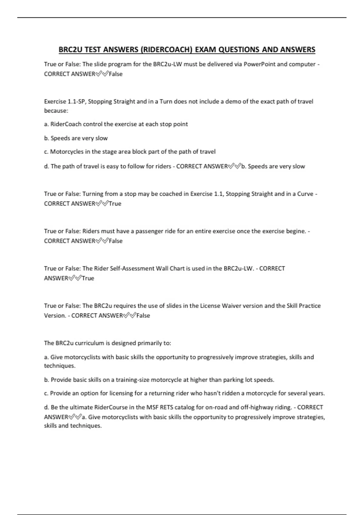 BRC2U TEST ANSWERS (RIDERCOACH) EXAM QUESTIONS AND ANSWERS True or False: The slide program for the BRC2u-LW must be delivered via PowerPoint and computer - CORRECT ANSWERFalse Exercise 1.1-SP, Stopping Straight and in a Turn does not include a demo of the exact path of travel because: a. RiderCoach control the exercise at each stop point b. Speeds are very slow c. Motorcycles in the stage area block part of the path of travel d. The path of travel is easy to follow for riders - CORRECT ANSWERb. Speeds are very slow