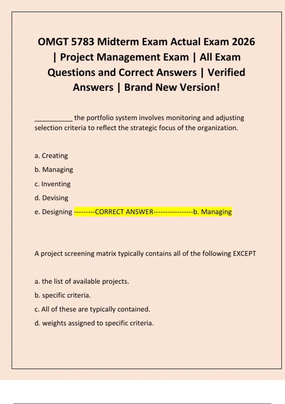 This document is the OMGT 5783 Midterm Exam for Project Management, specifically designed to test students' understanding of key project management concepts. The exam consists of a series of questions, each followed by multiple-choice answers, with the correct answer indicated. Topics covered in this exam include portfolio management, project screening matrices, project life cycles, project scope statements, and the classification of project criteria. Students are also tested on their knowledge of project milestones, organizational culture's impact on estimation, and preferred estimation approaches for projects with varying degrees of uncertainty. The exam emphasizes the importance of understanding different project management life cycles, including the project life cycle, which is integral for managing transitions from project start to completion. Students are expected to recognize the characteristics of these life cycles and how they influence project management processes. Additionally, the exam addresses the significance of cultural norms in the accuracy of project estimates, highlighting how organizational culture can affect project outcomes.