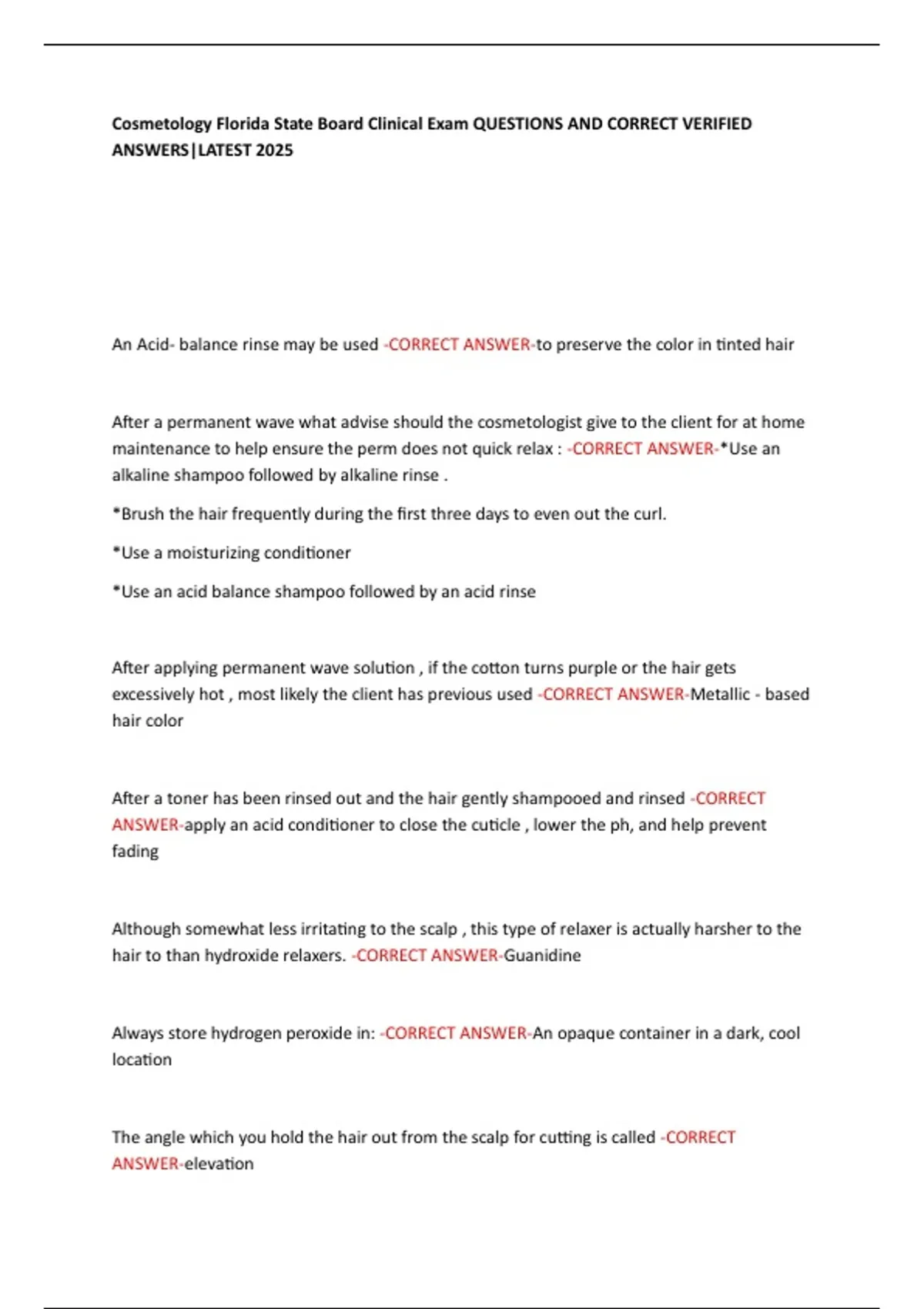 Cosmetology Florida State Board Clinical Exam QUESTIONS AND CORRECT VERIFIED