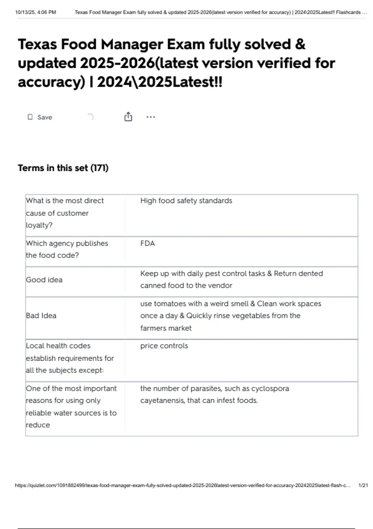 , 10/13/25, 4:06 PM Texas Food Manager Exam fully solved & updated 2025-2026(latest version verified for accuracy) | 2024\2025Latest!! Flashcards …