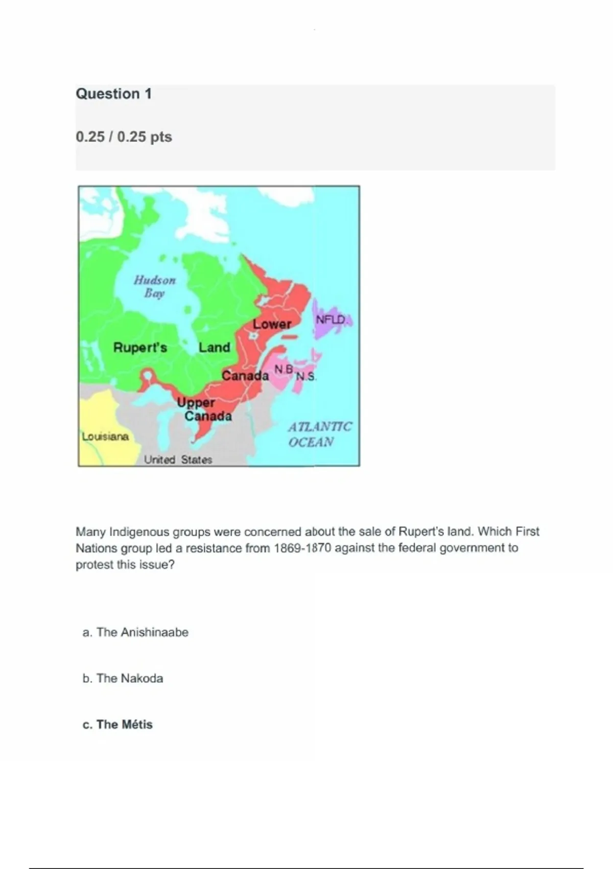 Question 1 0.25 / 0.25 pts Many Indigenous groups were concerned about the sale of Rupert’s land. Which First Nations group led a resistance from against the federal government to protest this issue? a. The Anishinaabe b. The Nakoda c. The Métisd. The Haudenosaunee Question 2 0.25 / 0.25 pts Who were the Indigenous groups primarily involved in negotiating the first three treaties? a. The Stoney, Métis, and Creeb. The Anishinaabe, Swampy Cree, and Métis c. The Blackfoot Confederacy and the Métis d. The Anishinaabe and Plains Cree Question 3 0.25 / 0.25 pts These ______ were given out as commemorative objects at Treaties 3,4, 5, 6, and 7. What are they? a. Treaty Coinsb. Treaty Medals c. Treaty Pendants d. Scrip Question 4 0.25 / 0.25 pts Noticeable changes in how settlers conducted treaty negotiations began after the war of 1812. Why? a. The Hudson’s Bay Company disappeared and treaty negotiations became less important b. The British no longer feared American aggression c. The Rupert’s Land Transfer solved all outstanding issues with Aboriginal Title d. The federal government shifted from a military to civilian administration e. A and B f. B and D g. D and CQuestion 5 0.25 / 0.25 pts When was Confederation? a. 1867 b. 1876 c. 1885 d. 1860 Question 6 0.25 / 0.25 pts During the 1860s, demographics in Canada were shifting as settlers began to outnumber First Peoples. Why was there a demographic shift? a. Indigenous peoples were dying off because they could not compete b. Settlers were immigrating in greater numbers from Britain c. Indigenous peoples were immigrating south to Americad. Settlers began having bigger families Question 7 0.25 / 0.25 pts How many of today's provinces and territories did Rupert’s land cover? a. 3 (Quebec, Ontario, Manitoba) b. 3 (Saskatchewan, Manitoba, Ontario) c. 2 (Ontario and Manitoba) d. 7 (Alberta, Saskatchewan, Manitoba, Ontario, Quebec, Northwestern Territories, Nunavut) Question 8 0.25 / 0.25 pts Why did the Métis resist the Rupert’s Land transfer? a. They preferred working with the HBC over the governmentb. They wanted to sell the land to someone else c. They are a naturally warring tribe d. Their property rights had not been taken into consideration Question 9 0.25 / 0.25 pts The Red River Resistance led to the creation of which province? a. Alberta b. Ontario c. British Columbia d. Manitoba Question 10 0.25 / 0.25 pts How much land were the Métis promised in the Manitoba Act of 1870?a. 1.2 million acres b. 640 acres per family of five c. 1.4 million acres d. 140 acres per family of five Question 11 0.25 / 0.25 pts The Métis successfully received all their allotted land promised to them by the federal government. True False Question 12 0.25 / 0.25 pts The failure to administer the land transfer to the Métis constitutes an infringement of their rights.True False Question 13 0.25 / 0.25 pts In the treaty negotiations for Treaty 1-3, the First Nations people had to take whatever the government offered them because they were desperate. True False Question 14 0.25 / 0.25 pts Each tribe has a different way of nominating their leaders and speakers depending on their own traditions. True FalseQuestion 15 0.25 / 0.25 pts Why did Treaty 3 take so long to negotiate? a. The federal government refused to honor a previous treaty b. The Anishinaabe asked for too much in the negotiations c. The federal government couldn’t find negotiators d. The federal government was too busy with the first two treaties Question 16 0.25 / 0.25 pts Negotiators on behalf of the Crown did not properly explain the land surrenders clause to Indigenous signatories, preferring to frame these clauses in oral discussions as "land sharing" or "renting" clauses. True FalseQuestion 17 0.25 / 0.25 pts The “Land Surrender clause” was never discussed explicitly in the negotiations for the Numbered Treaties. True False Question 18 0.25 / 0.25 pts After Treaty One, the federal government failed to provide what to the Anishinaabe and Swampy Cree? a. Hunting rights b. Roads c. Farming equipment d. Annuitiese. All of the above f. None of the Above g. C and D h. A and B Question 19 0.25 / 0.25 pts How many treaties did Alexander Morris negotiate on behalf of Canada? a. 4 b. 3 c. 2 d. 11 Question 20 0.25 / 0.25 ptsIn Treaty 3, First Nations agreed to share the lands with federal to what degree? a. Only the depth of a plow b. Lands only and not the lakes c. Only the reserve lands d. The entire lands