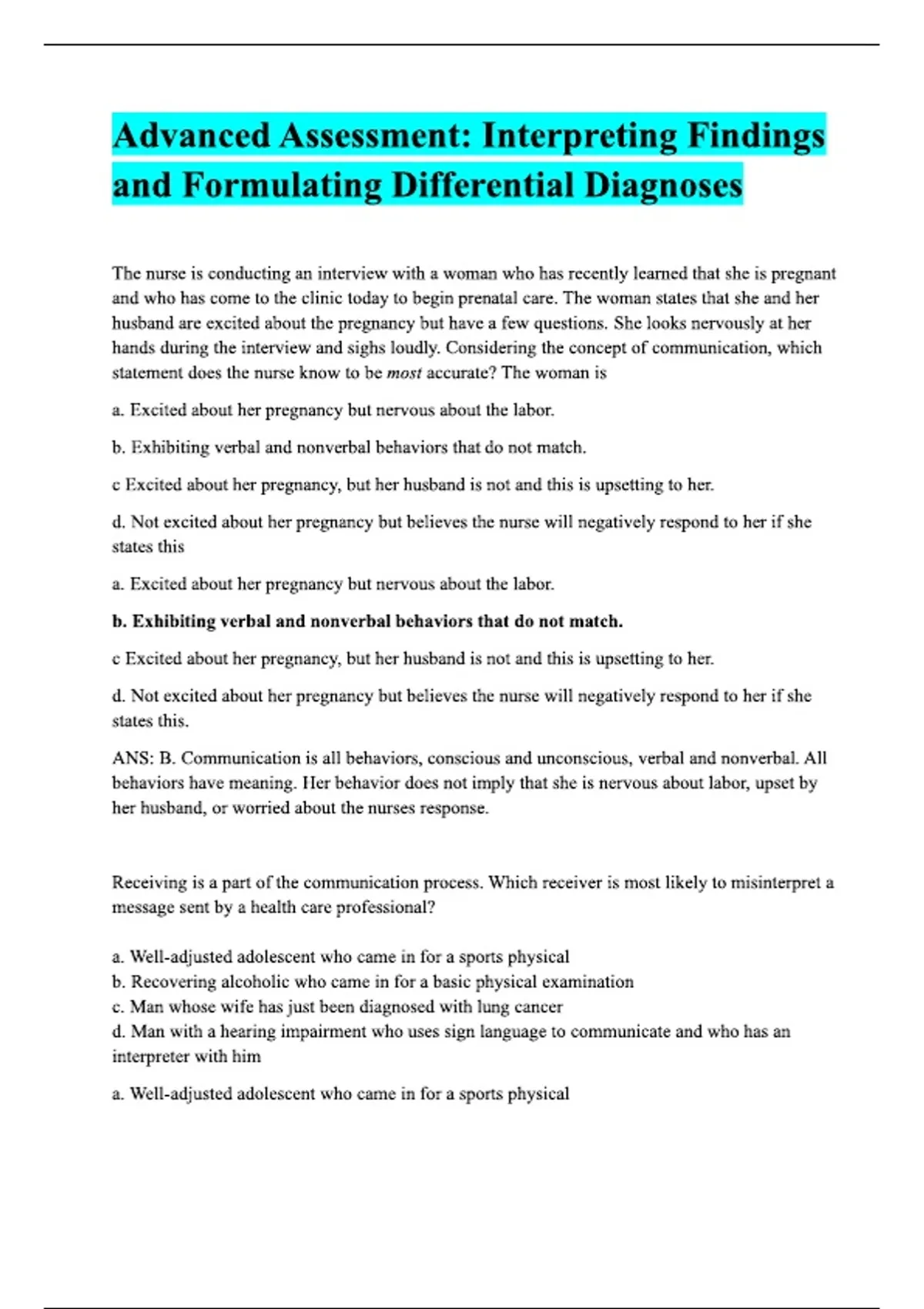 Advanced Assessment: Interpreting Findings and Formulating Differential Diagnoses The nurse is conducting an interview with a woman who has recently learned that she is pregnant and who has come to the clinic today to begin prenatal care. The woman states that she and her husband are excited about the pregnancy but have a few questions. She looks nervously at her hands during the interview and sighs loudly. Considering the concept of communication, which statement does the nurse know to be most accurate? The woman is a. Excited about her pregnancy but nervous about the labor. b. Exhibiting verbal and nonverbal behaviors that do not match. c Excited about her pregnancy, but her husband is not and this is upsetting to her. d. Not excited about her pregnancy but believes the nurse will negatively respond to her if she states this a. Excited about her pregnancy but nervous about the labor. b. Exhibiting verbal and nonverbal behaviors that do not match. c Excited about her pregnancy, but her husband is not and this is upsetting to her. d. Not excited about her pregnancy but believes the nurse will negatively respond to her if she states this. ANS: B. Communication is all behaviors, conscious and unconscious, verbal and nonverbal. All behaviors have meaning. Her behavior does not imply that she is nervous about labor, upset by her husband, or worried about the nurses response. Receiving is a part of the communication process. Which receiver is most likely to misinterpret a message sent by a health care professional? a. Well-adjusted adolescent who came in for a sports physical b. Recovering alcoholic who came in for a basic physical examination c. Man whose wife has just been diagnosed with lung cancer d. Man with a hearing impairment who uses sign language to communicate and who has an interpreter with him a. Well-adjusted adolescent who came in for a sports physical b. Recovering alcoholic who came in for a basic physical examination c. Man whose wife has just been diagnosed with lung cancer d. Man with a hearing impairment who uses sign language to communicate and who has an interpreter with him ANS: C. The receiver attaches meaning determined by his or her experiences, culture, self- concept, and current physical and emotional states. The man whose wife has just been diagnosed with lung cancer may be experiencing emotions that affect his receiving.