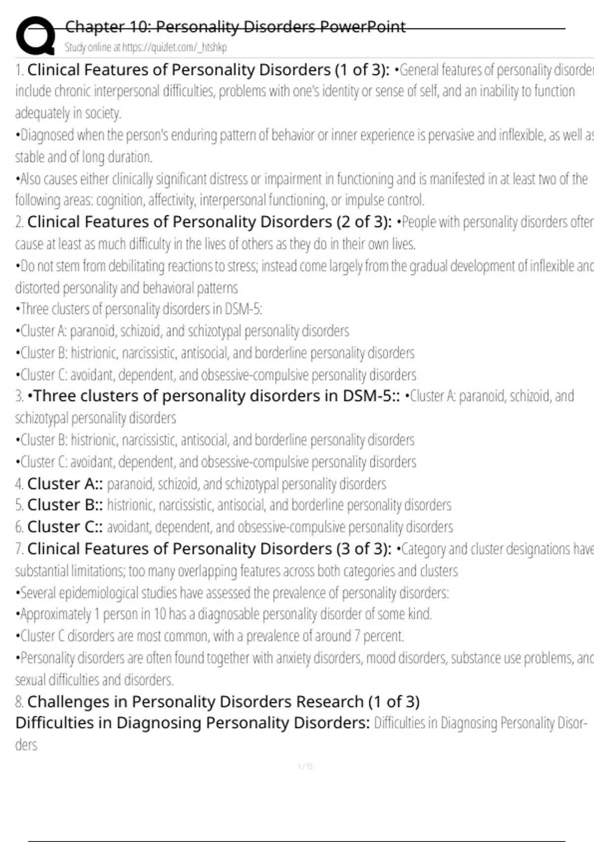 1. Clinical Features of Personality Disorders (1 of 3): •General features of personality disorder