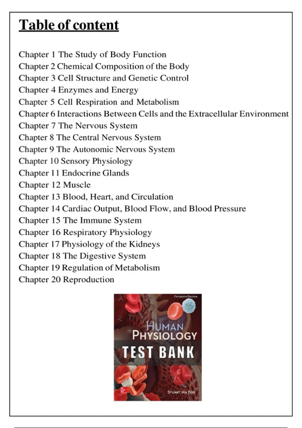 Access the complete Test Bank for Human Physiology, 15th Edition by Stuart Fox and Krista Rompolski. Includes detailed chapter-by-chapter multiple-choice, true/false, and short-answer questions with verified answers—ideal for physiology, nursing, and health science students preparing for exams and quizzes.