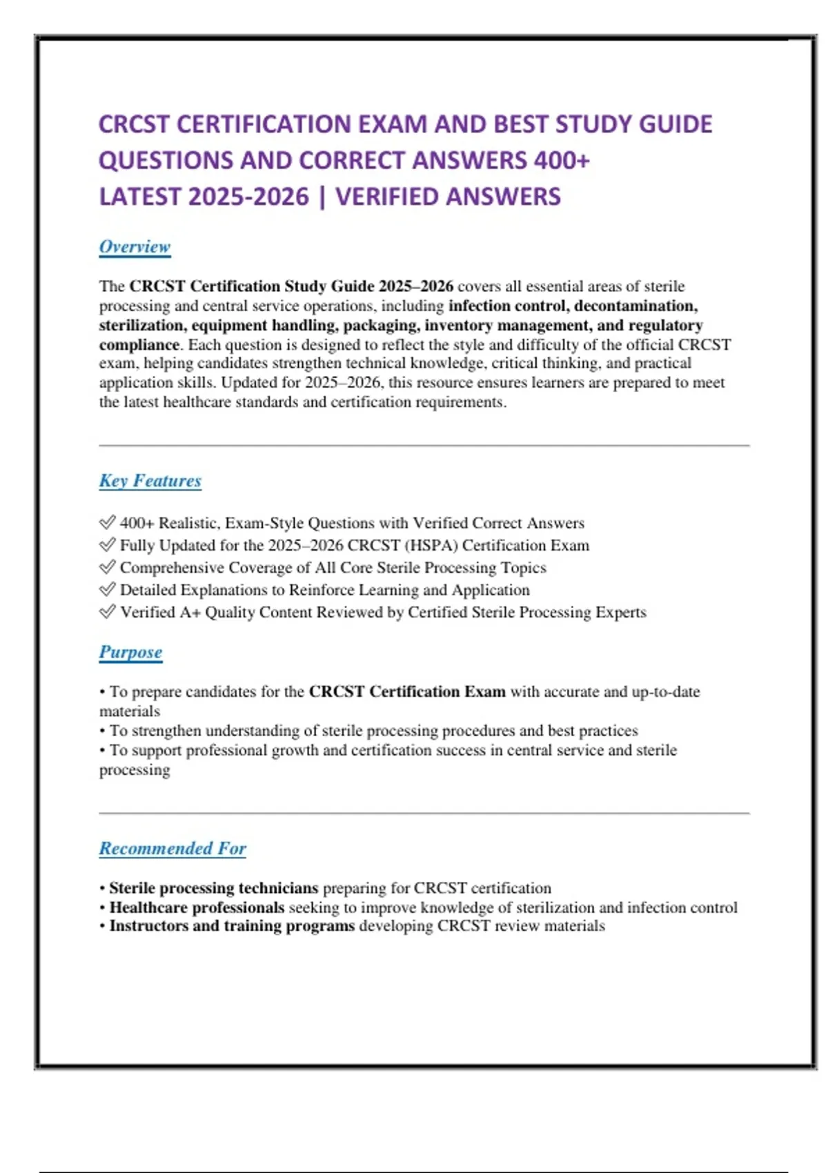 The CRCST Certification Exam and Study Guide 2025–2026 is a comprehensive, up-to-date resource created to help sterile processing professionals prepare effectively for the Certified Registered Central Service Technician (CRCST) certification. Featuring 400+ verified, exam-style questions with correct and detailed answers, this guide aligns with the latest IAHCSMM (now HSPA) standards for 2025–2026, ensuring complete accuracy and real-world relevance for exam and professional success.