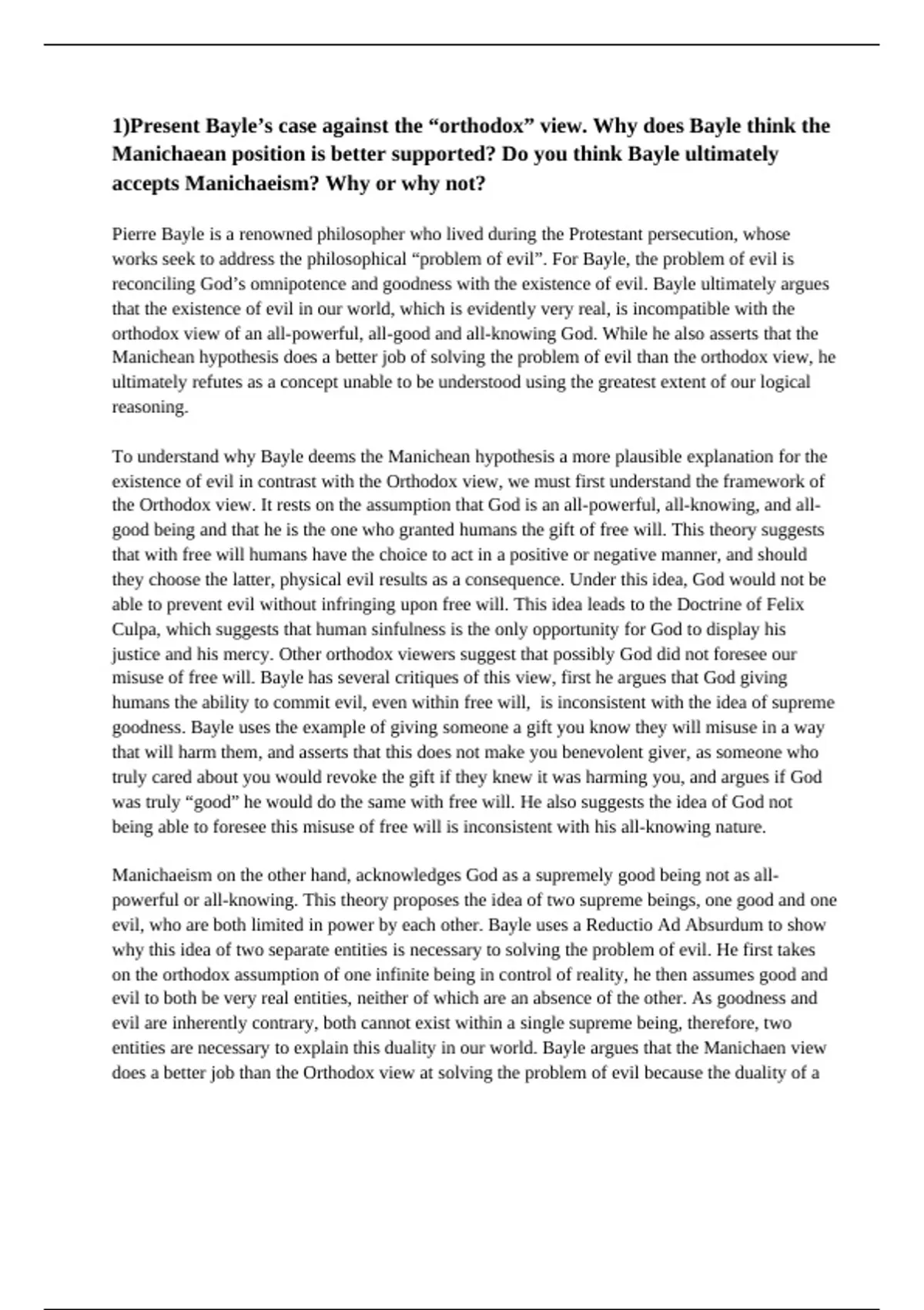 1)Present Bayle’s case against the “orthodox” view. Why does Bayle think the