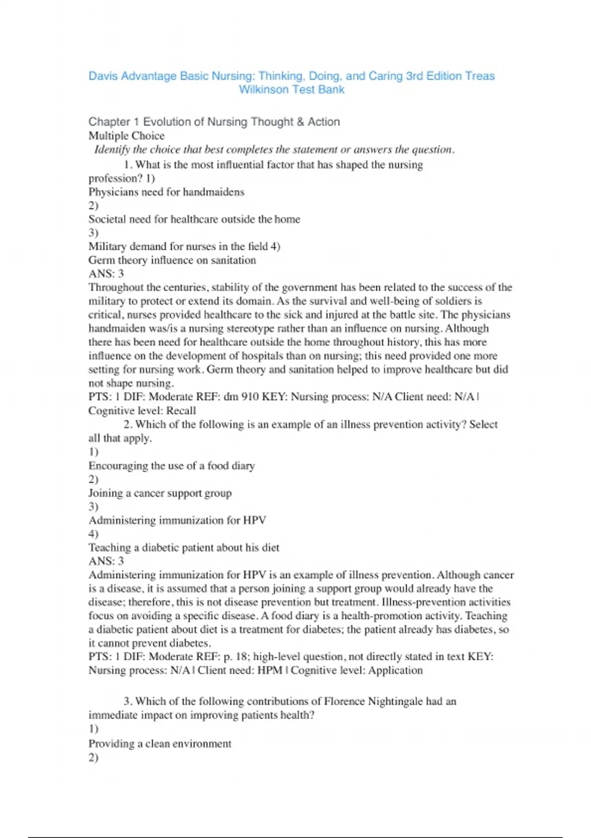 davis advantage basic nursing: thinking, doing and caring 3rd edition treas wilkinson test bank