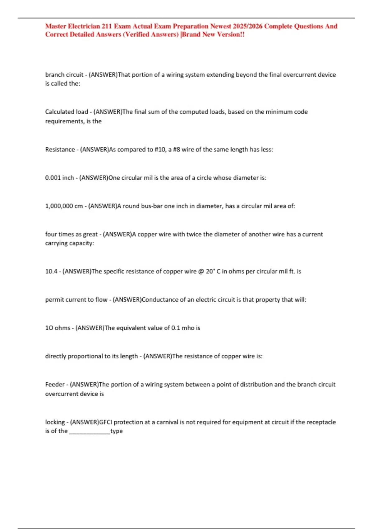 Master Electrician 211 Exam Actual Exam Preparation Newest 2025/2026 Complete Questions And
