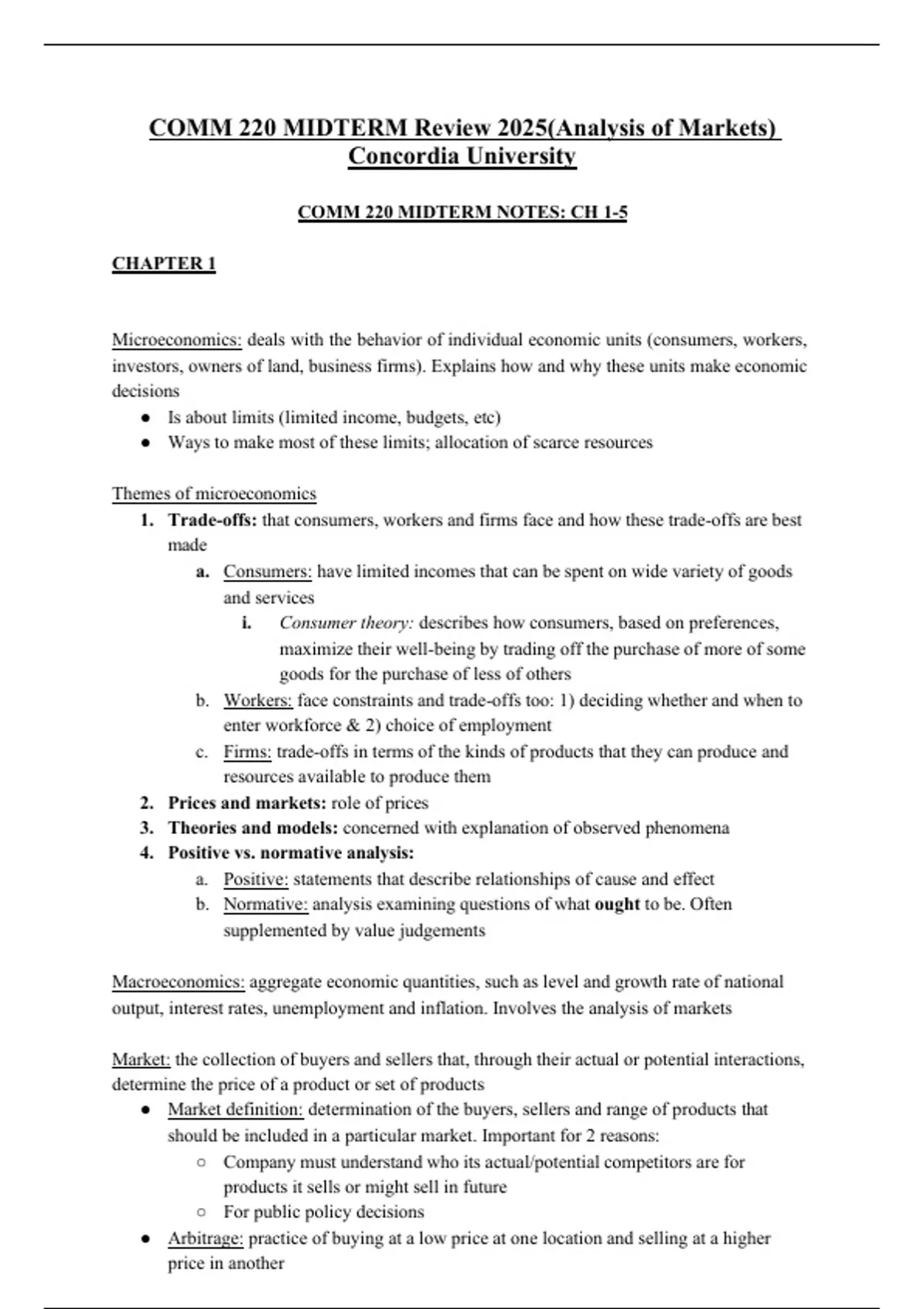 COMM 220 MIDTERM Review 2025(Analysis of Markets) Concordia University COMM 220 MIDTERM NOTES: CH 1-5 CHAPTER 1 Microeconomics: deals with the behavior of individual economic units (consumers, workers, investors, owners of land, business firms). Explains how and why these units make economic decisions ● Is about limits (limited income, budgets, etc) ● Ways to make most of these limits; allocation of scarce resources Themes of microeconomics 1. Trade-offs: that consumers, workers and firms face and how these trade-offs are best made a. Consumers: have limited incomes that can be spent on wide variety of goods and services i. Consumer theory: describes how consumers, based on preferences, maximize their well-being by trading off the purchase of more of some goods for the purchase of less of others b. Workers: face constraints and trade-offs too: 1) deciding whether and when to enter workforce & 2) choice of employment c. Firms: trade-offs in terms of the kinds of products that they can produce and resources available to produce them 2. Prices and markets: role of prices 3. Theories and models: concerned with explanation of observed phenomena 4. Positive vs. normative analysis: a. Positive: statements that describe relationships of cause and effect b. Normative: analysis examining questions of what ought to be. Often supplemented by value judgements Macroeconomics: aggregate economic quantities, such as level and growth rate of national output, interest rates, unemployment and inflation. Involves the analysis of markets Market: the collection of buyers and sellers that, through their actual or potential interactions, determine the price of a product or set of products ● Market definition: determination of the buyers, sellers and range of products that should be included in a particular market. Important for 2 reasons: ○ Company must understand who its actual/potential competitors are for products it sells or might sell in future ○ For public policy decisions ● Arbitrage: practice of buying at a low price at one location and selling at a higher price in another ● Market price: price prevailing in a competitive market ● Extent of a market: boundaries of a market, both geographical and in terms of range of products produced and sold within it Competitive vs. non-competitive markets: 1. Perfectly competitive market: market with many buyers and sellers, so that no single buyer or seller has a significant impact on price 2. Non-competitive markets: individual firms can jointly affect the price (oil market) Real vs nominal price:
