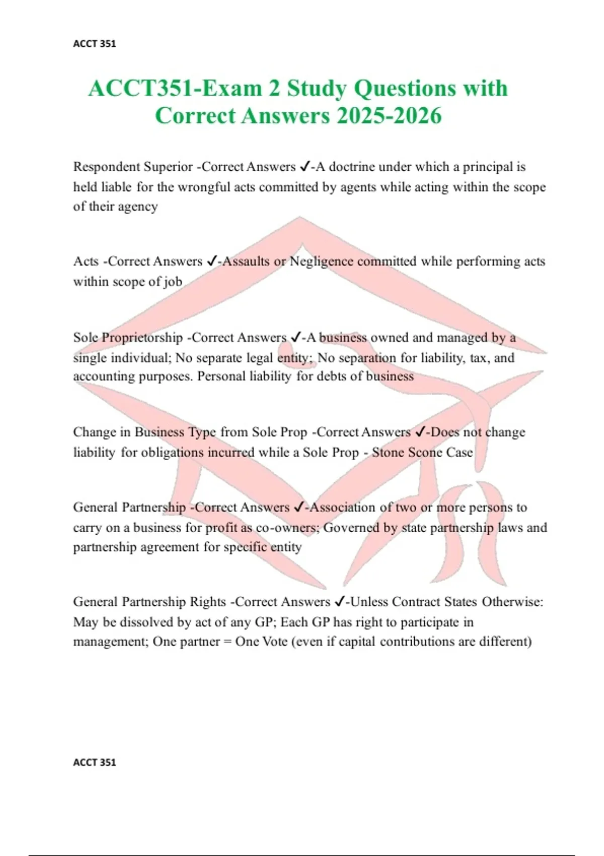Respondent Superior -Correct Answers -A doctrine under which a principal is held liable for the wrongful acts committed by agents while acting within the scope of their agency Acts -Correct Answers -Assaults or Negligence committed while performing acts within scope of job Sole Proprietorship -Correct Answers -A business owned and managed by a single individual; No separate legal entity; No separation for liability, tax, and accounting purposes. Personal liability for debts of business Change in Business Type from Sole Prop -Correct Answers -Does not change liability for obligations incurred while a Sole Prop - Stone Scone Case General Partnership -Correct Answers -Association of two or more persons to carry on a business for profit as co-owners; Governed by state partnership laws and partnership agreement for specific entity General Partnership Rights -Correct Answers -Unless Contract States Otherwise: May be dissolved by act of any GP; Each GP has right to participate in management; One partner = One Vote (even if capital contributions are different)
