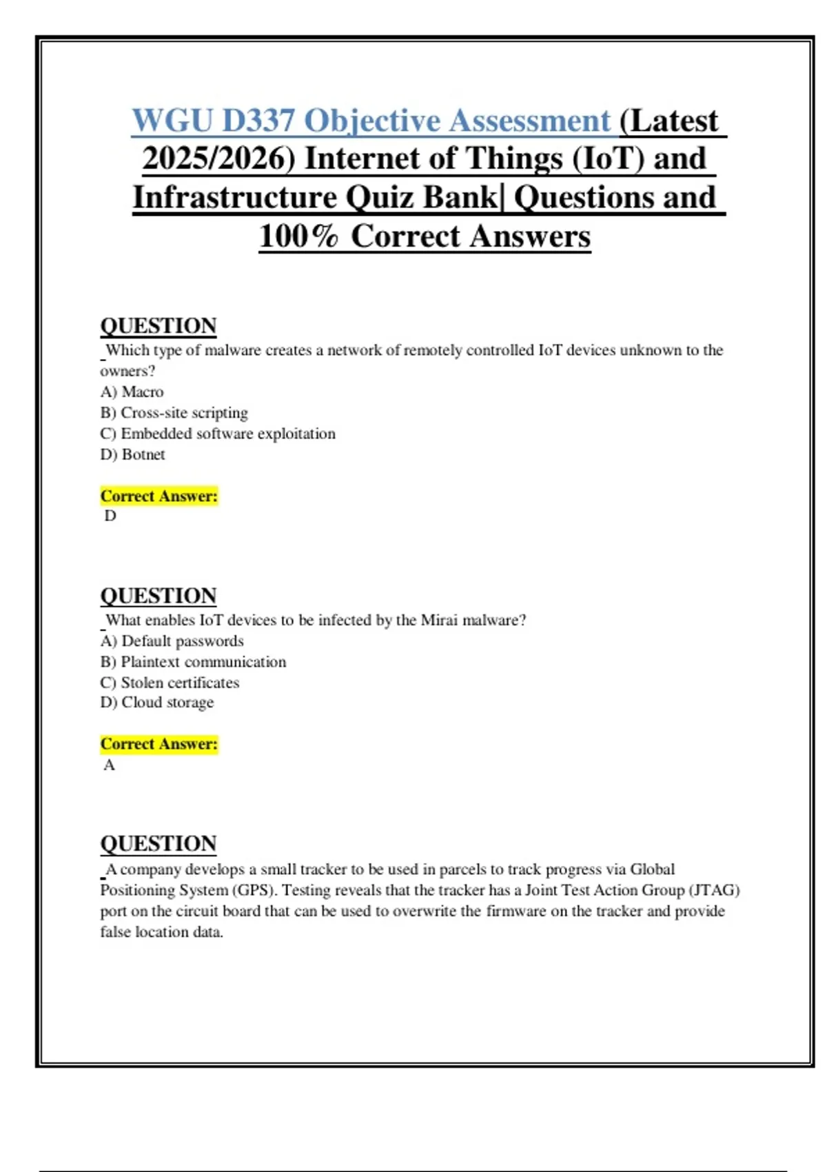 This document provides the full WGU D337 Objective Assessment Quiz Bank for the Internet of Things (IoT) and Infrastructure course, including all questions and 100% verified correct answers for 2025–2026. It covers topics such as IoT architecture, cybersecurity, data processing (Lambda and Kappa), blockchain applications, edge computing, ethical issues, and IoTSF Best Practice Guidelines. The material is ideal for exam preparation and mastering core IoT and cybersecurity concepts as outlined by WGU.