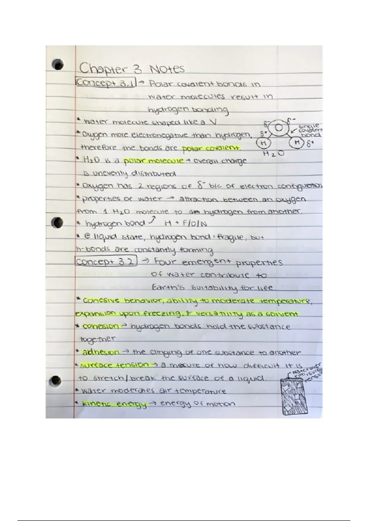 These notes go through Unit 1, Chapter 3 of AP Biology. Here are the concepts highlighted in this document: 1. Concept 3.1 - The first concept is about polar covalent bonds in water molecules that result in hydrogen bonding. 2. Concept 3.2 - This concept goes over the four emergent properties of water that contribute to earth's sustainability for life. 3. Concept 3.3 - Finally, concept 3.3 highlights that acidic and basic conditions affect living organisms. Looking for a Unit 1 master guide? It has been posted earlier covering ALL topics in Unit 1.