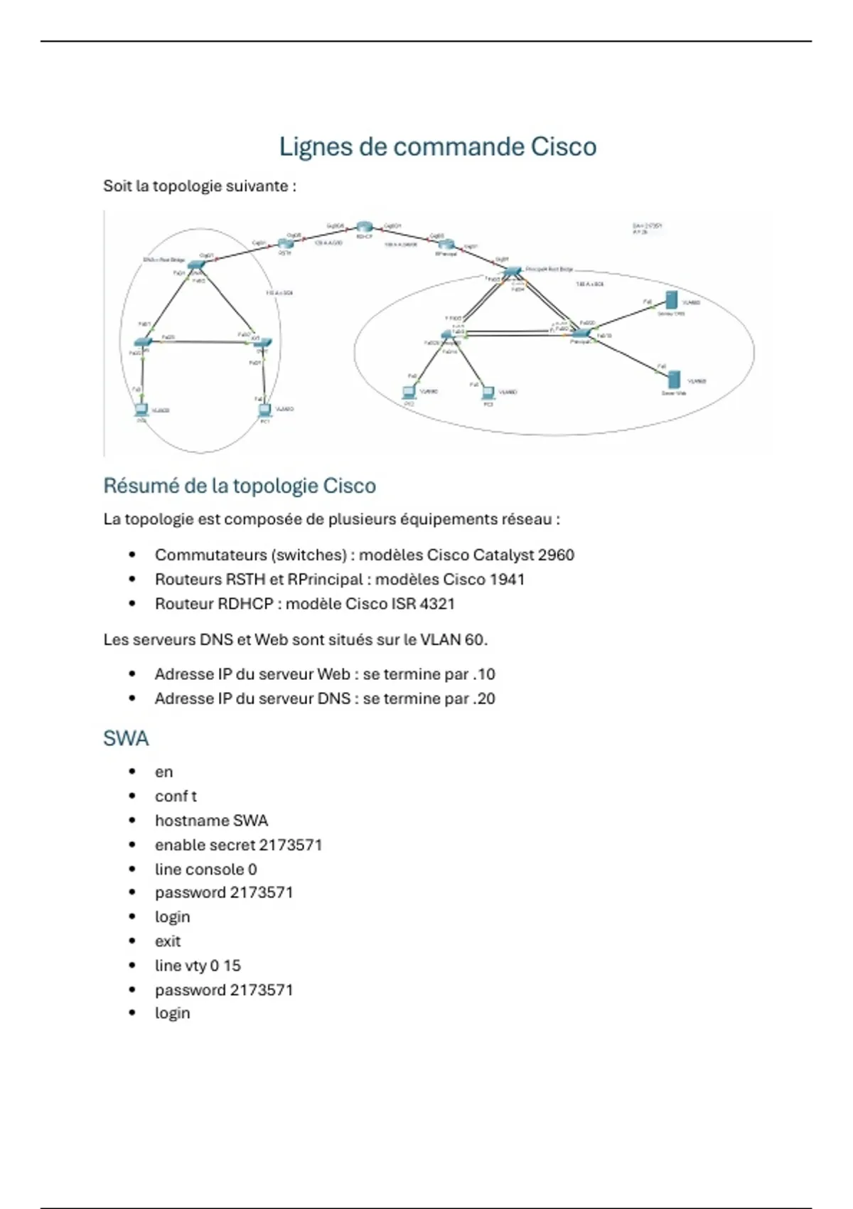 Ce document présente la configuration complète d’un réseau Cisco intégrant un serveur DNS et un serveur Web. Il explique comment mettre en place le service DNS pour qu’il reconnaisse le nom de domaine , ainsi que les étapes nécessaires sur les routeurs et commutateurs afin d’assurer une résolution de noms correcte dans l’ensemble du réseau. On y retrouve les configurations liées aux VLANs, au DHCP, au routage, et à l’intégration des serveurs dans le réseau, ainsi que les bonnes pratiques à appliquer pour une infrastructure fonctionnelle et stable.