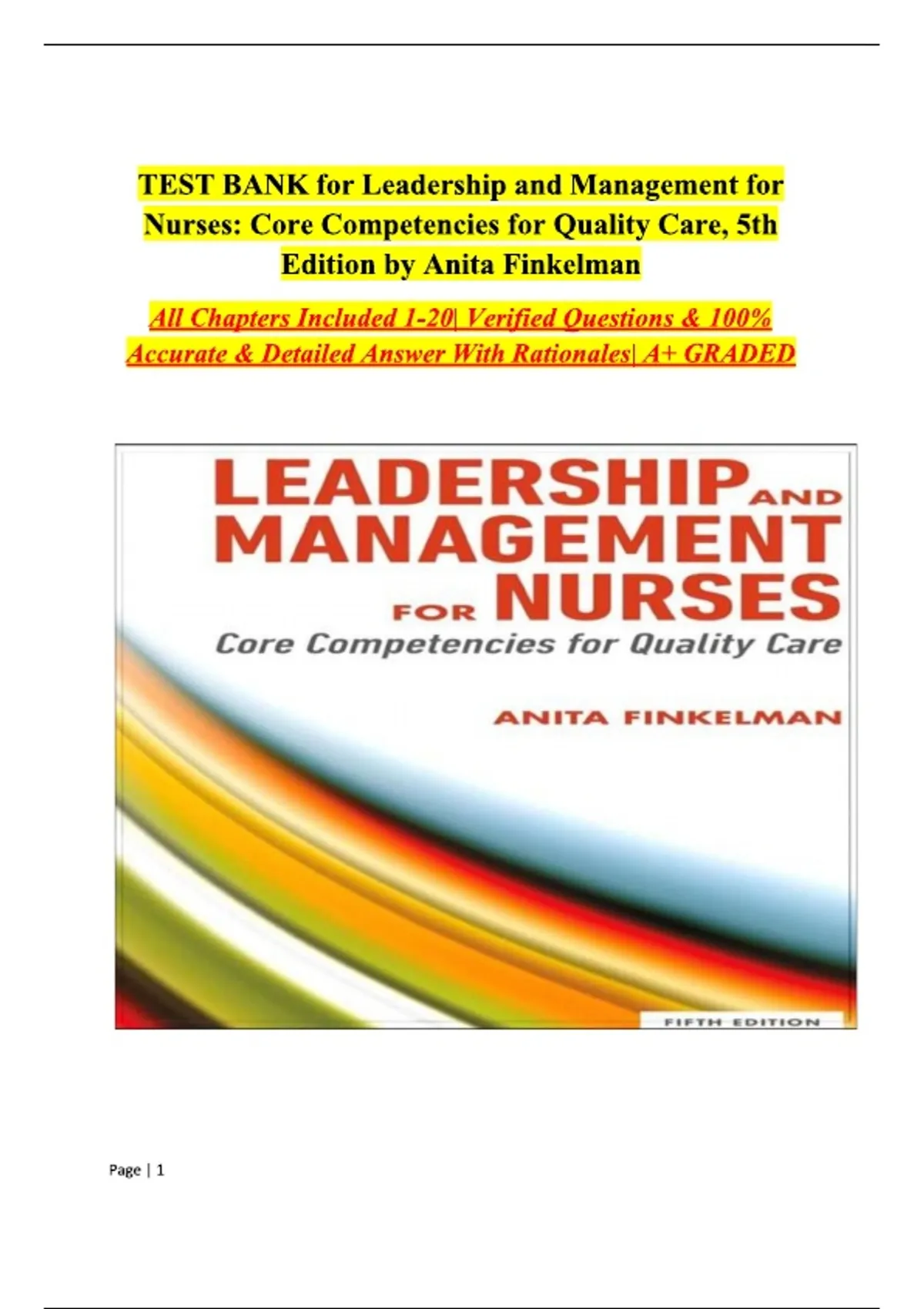 This document is a comprehensive test bank for the 5th Edition of Leadership and Management for Nurses: Core Competencies for Quality Care by Anita Finkelman. It contains verified multiple-choice questions, detailed answers, and rationales for all chapters (1-20). The content focuses on essential concepts for nurse leaders and managers, covering topics such as the conceptual basis for leadership and management , modern leadership theories (like emotional intelligence and transformational leadership) , the distinctive roles and responsibilities of managers versus leaders , and the skills required for effective practice, including collaboration and building trust. It also addresses critical contemporary issues in the healthcare environment, such as organizational structure , health informatics , and patient-centered care and quality improvement