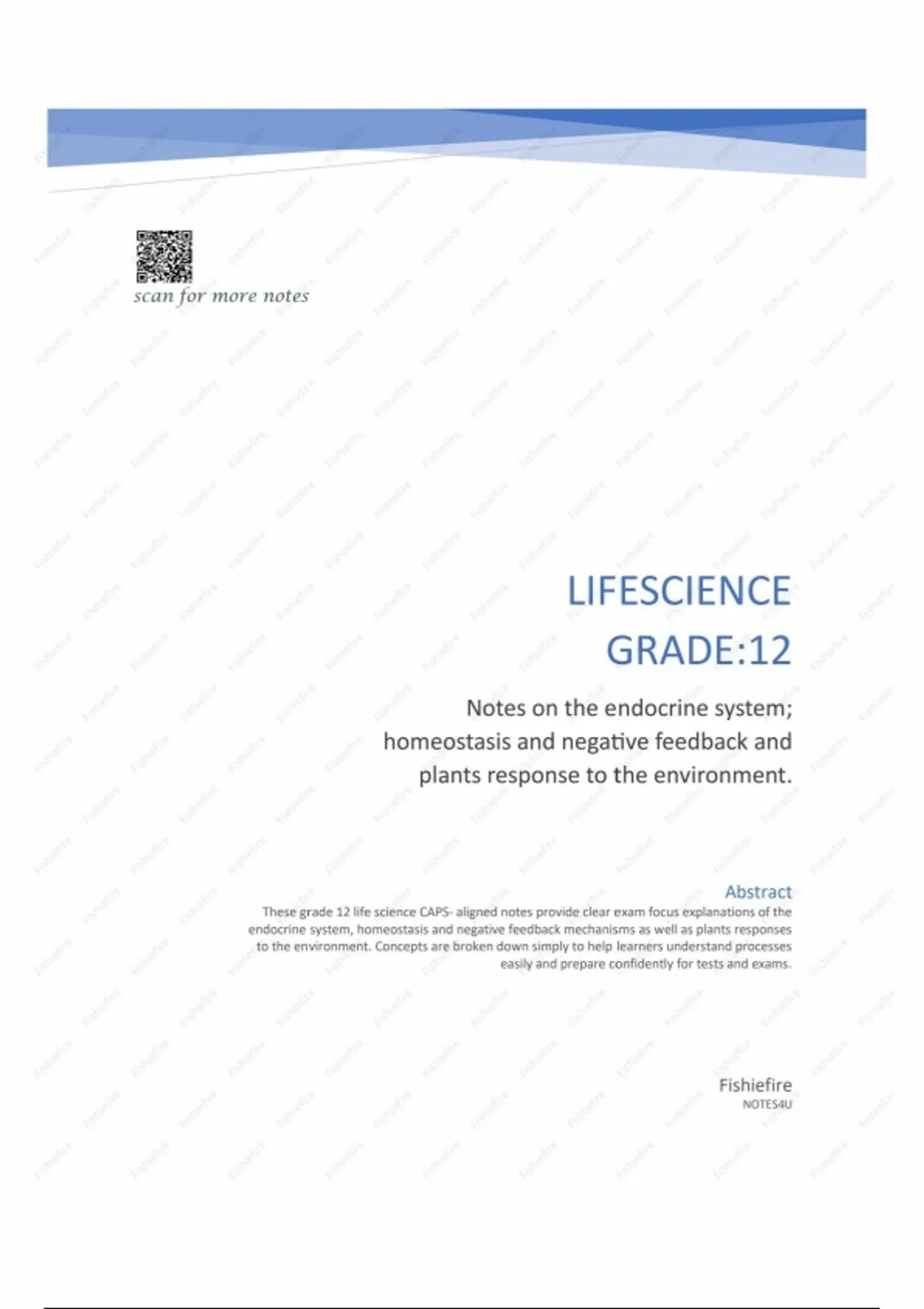 This Grade 12 Life Sciences study pack covers Homeostasis and Negative Feedback, Plant Responses to the Environment, and The Endocrine System, fully aligned to the CAPS curriculum. Notes are written in clear, simplified language to help you understand, revise, and prepare for tests and exams. Includes summaries, explanations, diagrams, and key concepts learners must know.