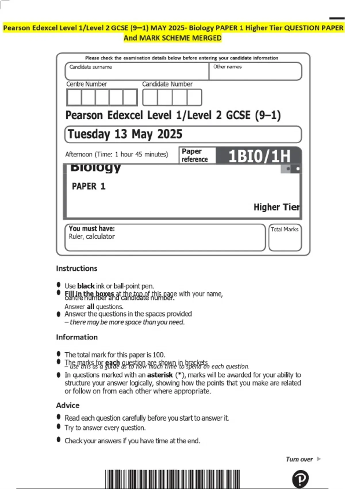 Pearson Edexcel Level 1/Level 2 GCSE (9—1) MAY 2025- Biology PAPER 1 Higher Tier QUESTION PAPER And MARK SCHEME MERGED