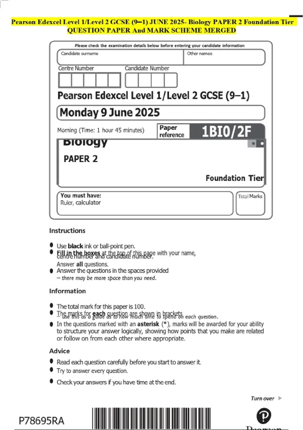 Pearson Edexcel Level 1/Level 2 GCSE (9–1) JUNE 2025- Biology PAPER 2 Foundation Tier QUESTION PAPER And MARK SCHEME MERGED