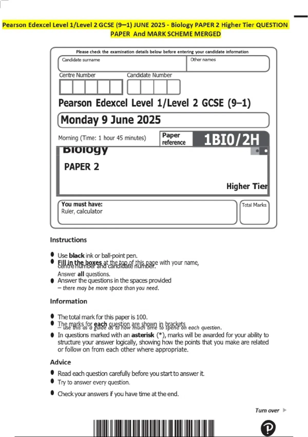 Pearson Edexcel Level 1/Level 2 GCSE (9-1) JUNE 2025 - Biology PAPER 2 Higher Tier QUESTION PAPER And MARK SCHЕМЕ МERGED