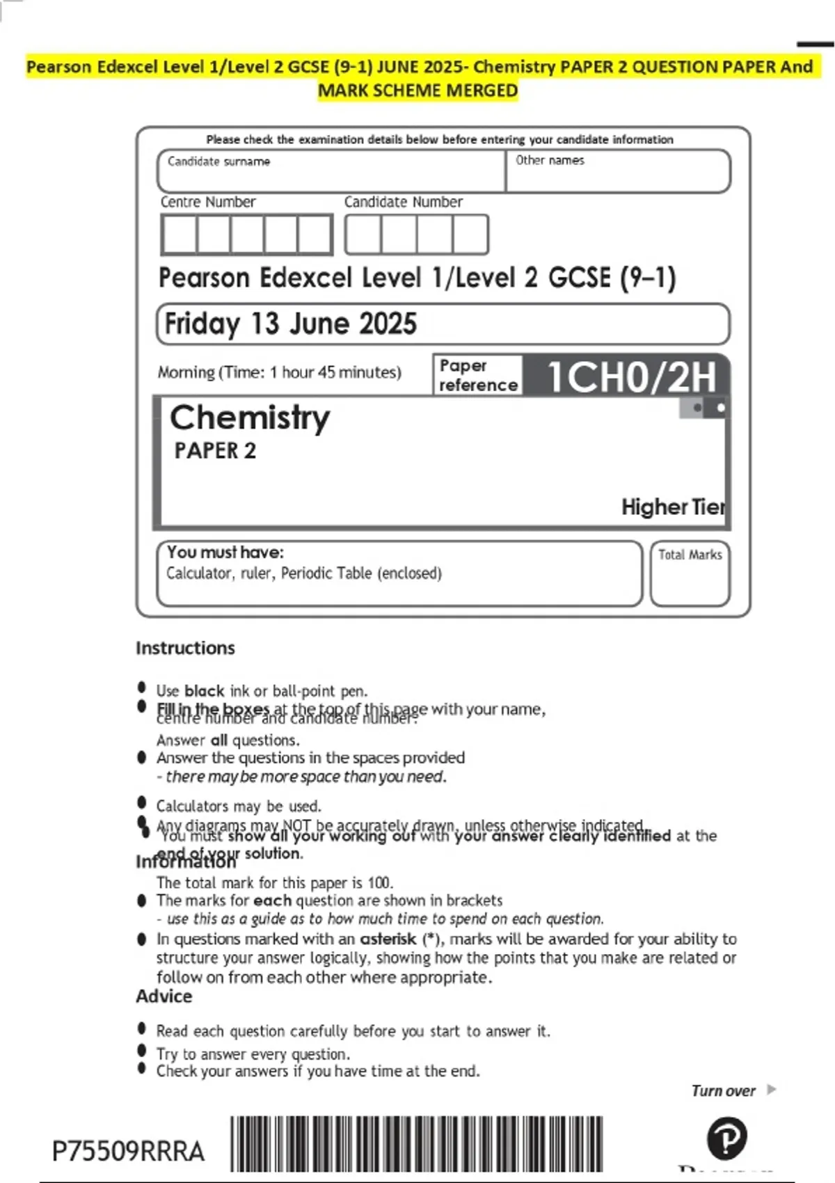 Pearson Edexcel Level 1/Level 2 GCSE (9-1) JUNE 2025- Chemistry PAPER 2 QUESTION PAPER And MARK SCHEME MERGED
