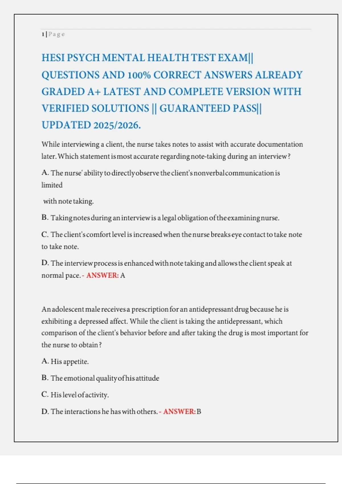 HESI PSYCH MENTAL HEALTH TEST EXAM|| QUESTIONS AND 100% CORRECT ANSWERS ALREADY GRADED A+ LATEST AND COMPLETE VERSION WITH VERIFIED SOLUTIONS || GUARANTEED PASS|| UPDATED 2025/2026.