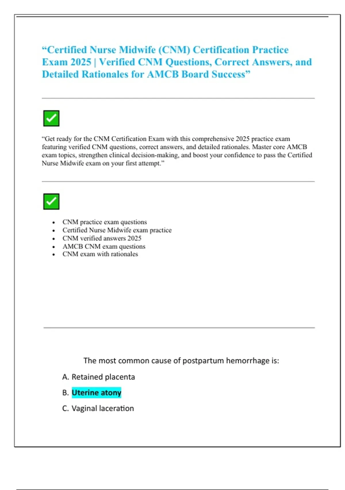 “Certified Nurse Midwife (CNM) Certification Practice Exam 2025 | Verified CNM Questions, Correct Answers, and Detailed Rationales for AMCB Board Success”