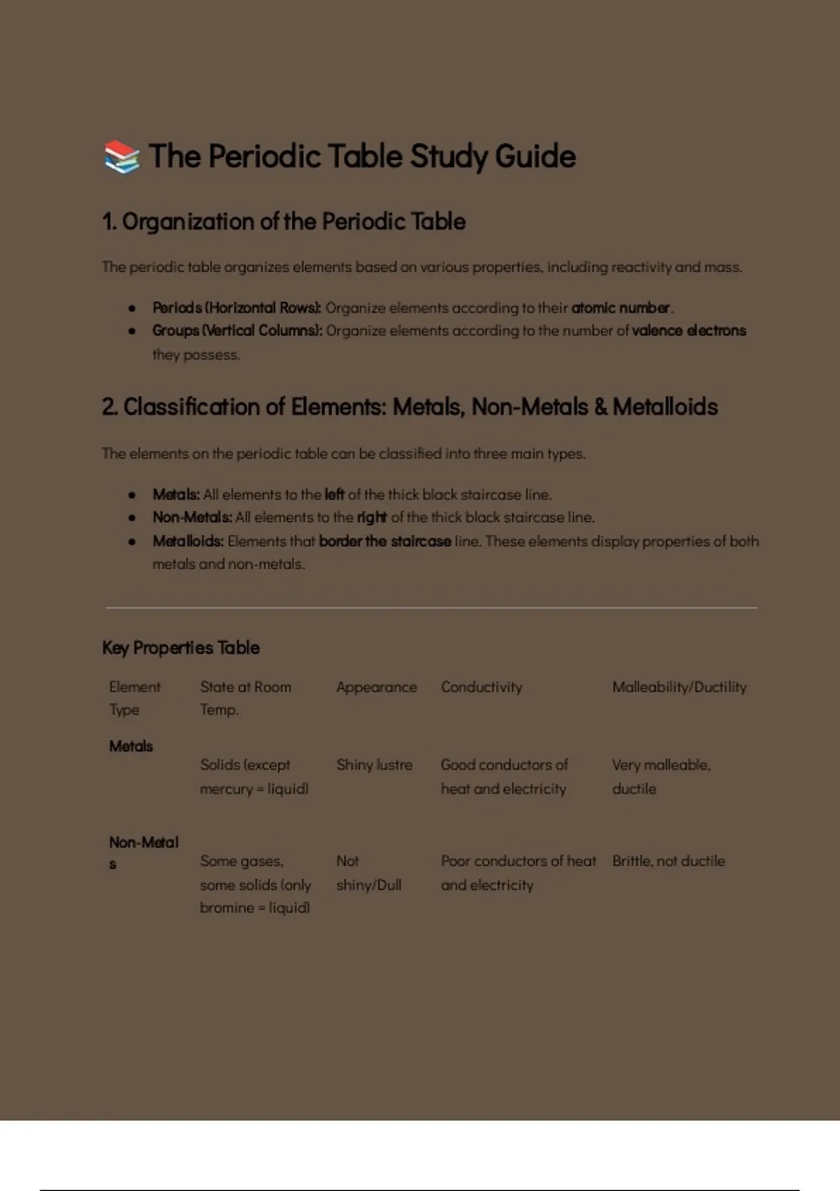 This comprehensive study guide summarizes the fundamental concepts of the Periodic Table, covering how elements are organized, classified, and how their structure relates to their reactivity. It details the organization by periods (atomic number) and groups (valence electrons) , and defines the key distinctions between metals, non-metals, and metalloids based on location and properties (state, appearance, conductivity, malleability). The guide also outlines the four major chemical families (Alkali Metals, Alkaline Earth Metals, Halogens, and Noble Gases) and their characteristic reactivity. Finally, it explains the role of valence electrons in chemical behavior and provides instruction on creating Electron Dot Diagrams (Lewis Diagrams).