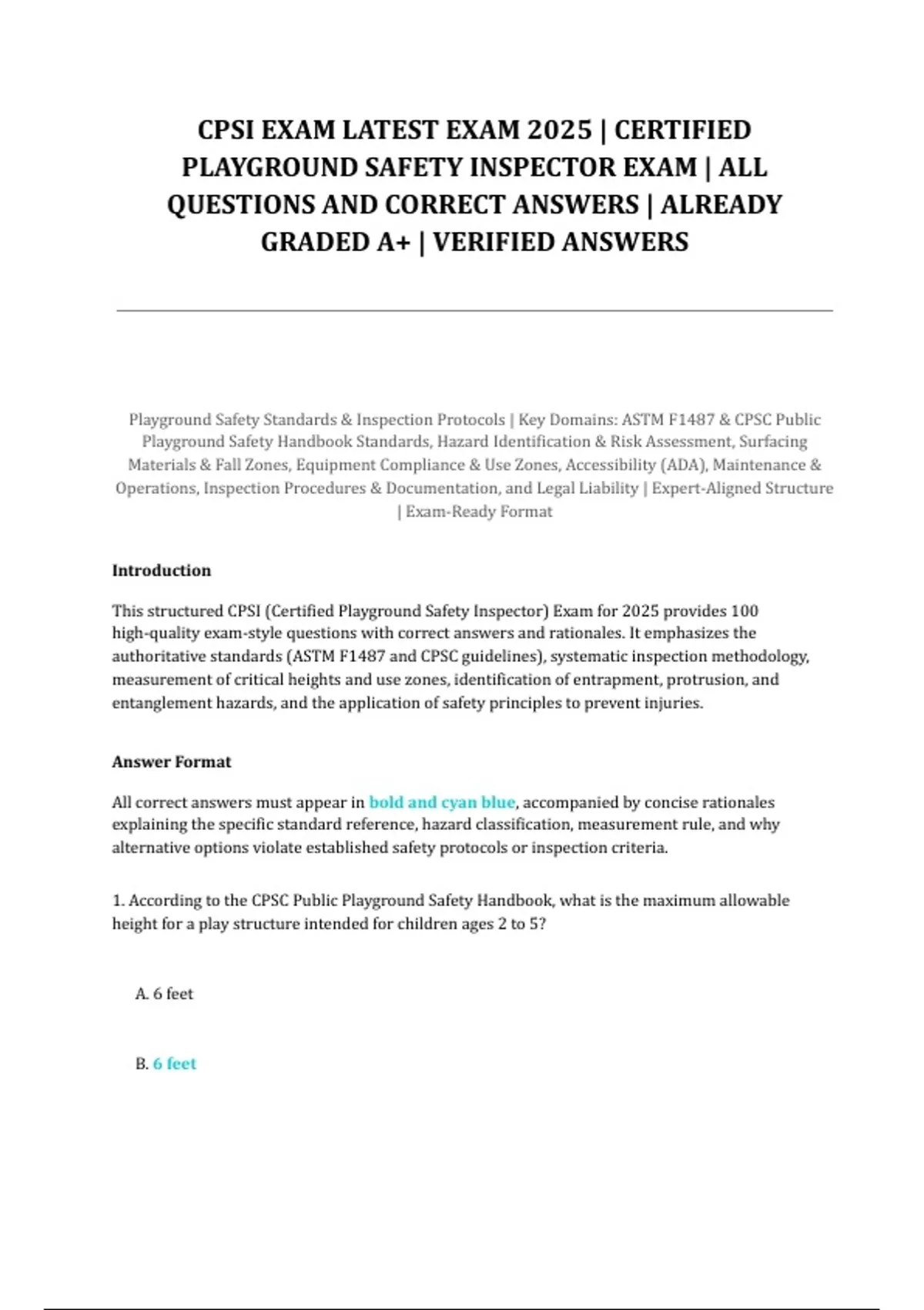 This structured CPSI (Certified Playground Safety Inspector) Exam for 2025 provides 100