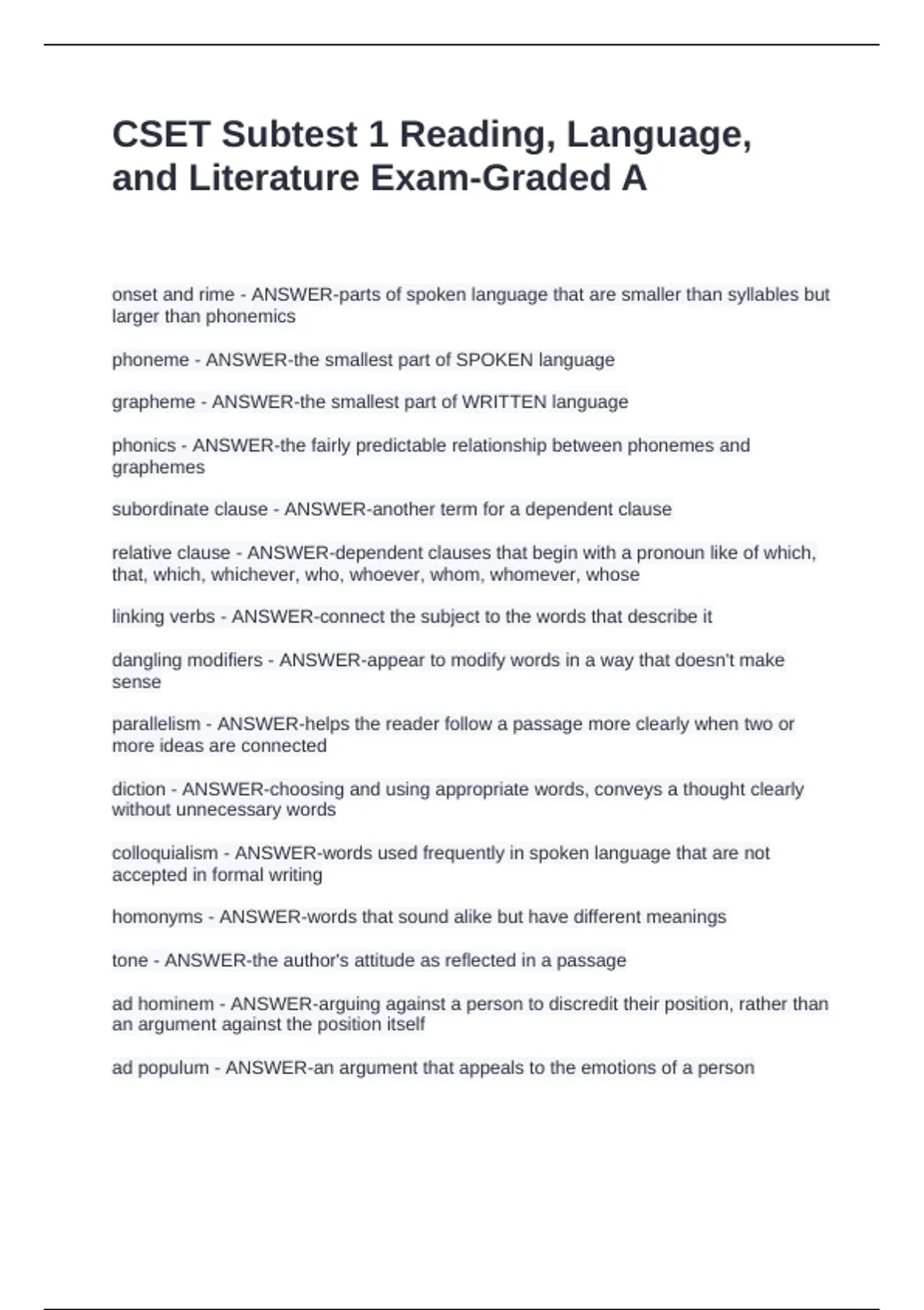 CSET Subtest 1 Reading, Language, and Literature Exam-Graded A