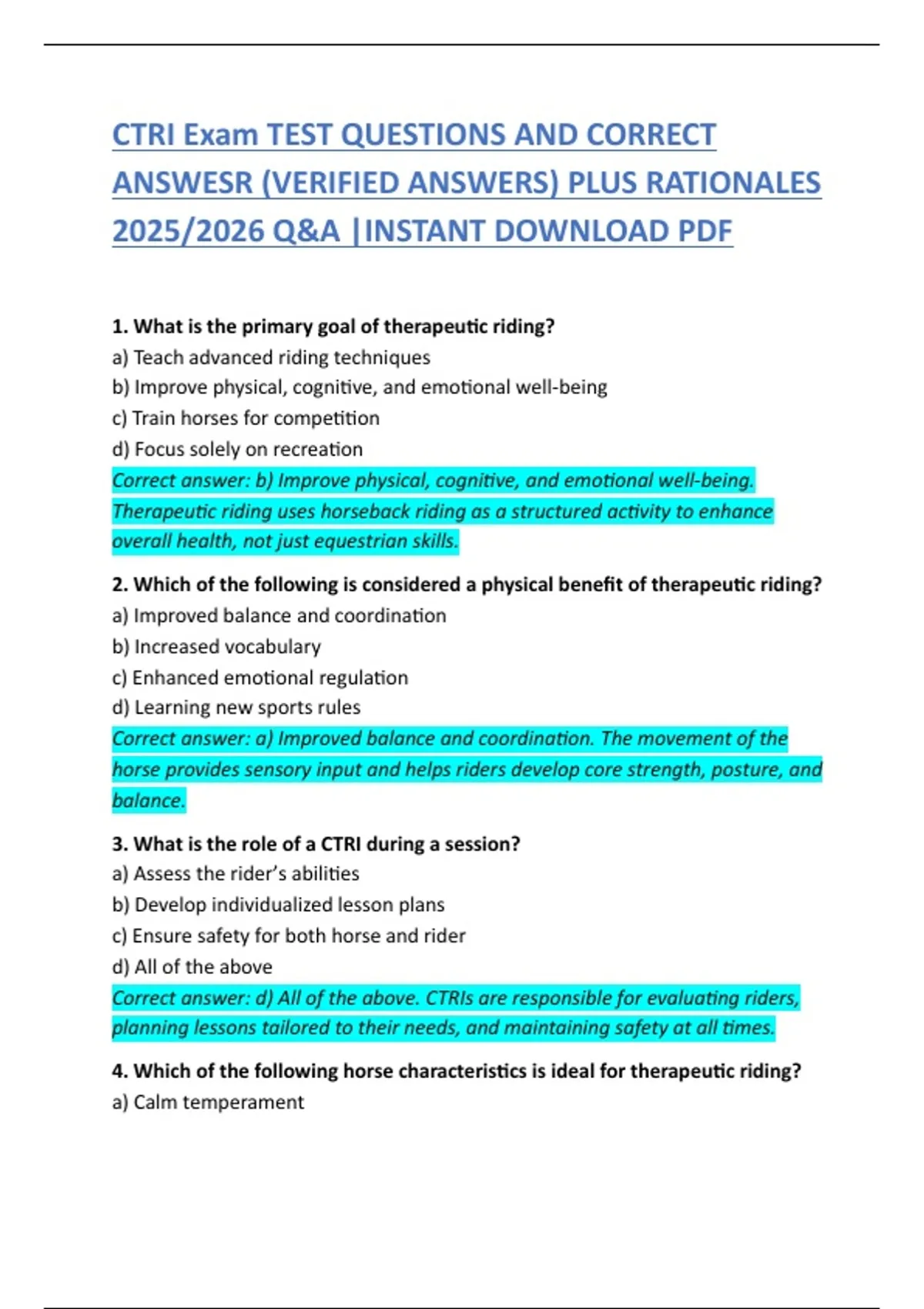 This study guide is designed for candidates preparing for the Certified Therapeutic Riding Instructor (CTRI) Exam. It includes a comprehensive set of practice questions covering essential topics such as equine management, riding instruction techniques, adaptive riding strategies, safety protocols, lesson planning, and client assessment. Each question comes with the correct answer and detailed explanations, helping learners reinforce knowledge, develop practical skills, and confidently prepare to pass the CTRI certification exam