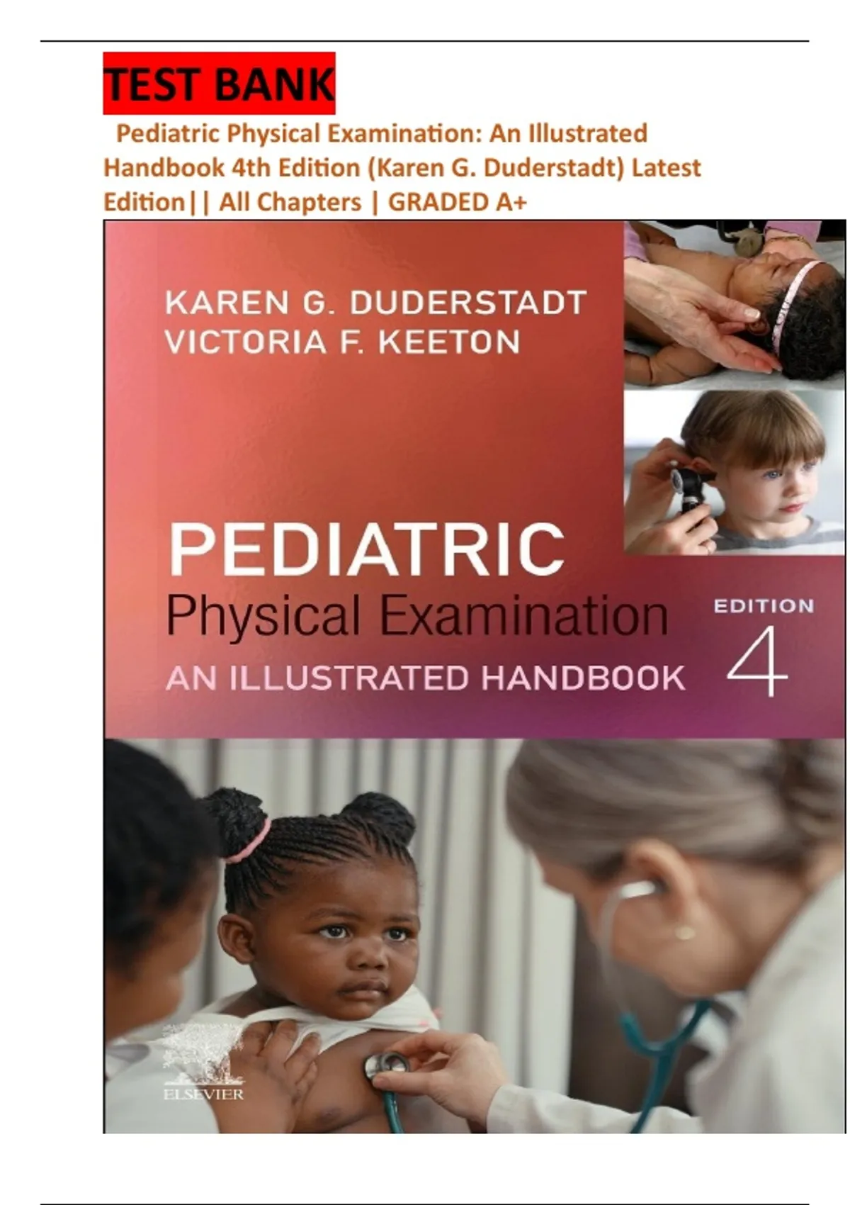 This document is a complete test bank for Pediatric Physical Examination: An Illustrated Handbook, 4th Edition by Karen G. Duderstadt and Victoria F. Keeton, containing all chapters with multiple-choice, case-based, and multiple-response questions with verified answers. It covers essential topics such as growth and developmental assessment, pediatric physical examination techniques, health history, immunizations, developmental screening, psychosocial evaluation, and family/environmental health, making it an excellent resource for students and educators to prepare effectively for exams and achieve Grade A+ results. pdf