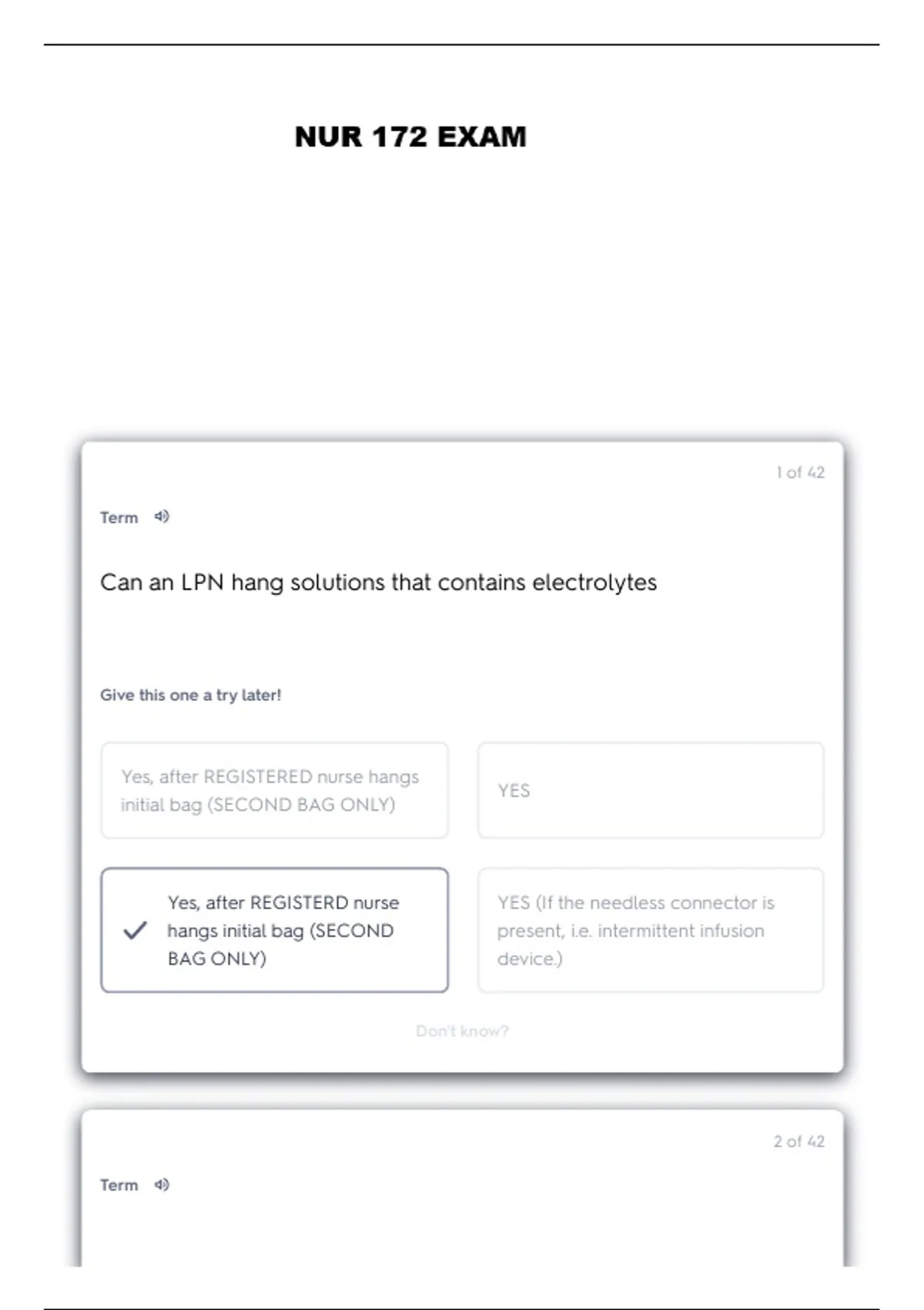 This document contains a detailed set of questions and verified answers focused on IV therapy scope of practice for NUR 172. It specifically addresses what Licensed Practical Nurses (LPNs) are permitted to initiate, maintain, regulate, or discontinue in intravenous therapy, including fluids, medications, blood products, central lines, PICCs, and PCA pumps. The content is highly structured and aligned with state-specific (Ohio) scope of practice guidelines, making it ideal for exams and clinical decision-making review.