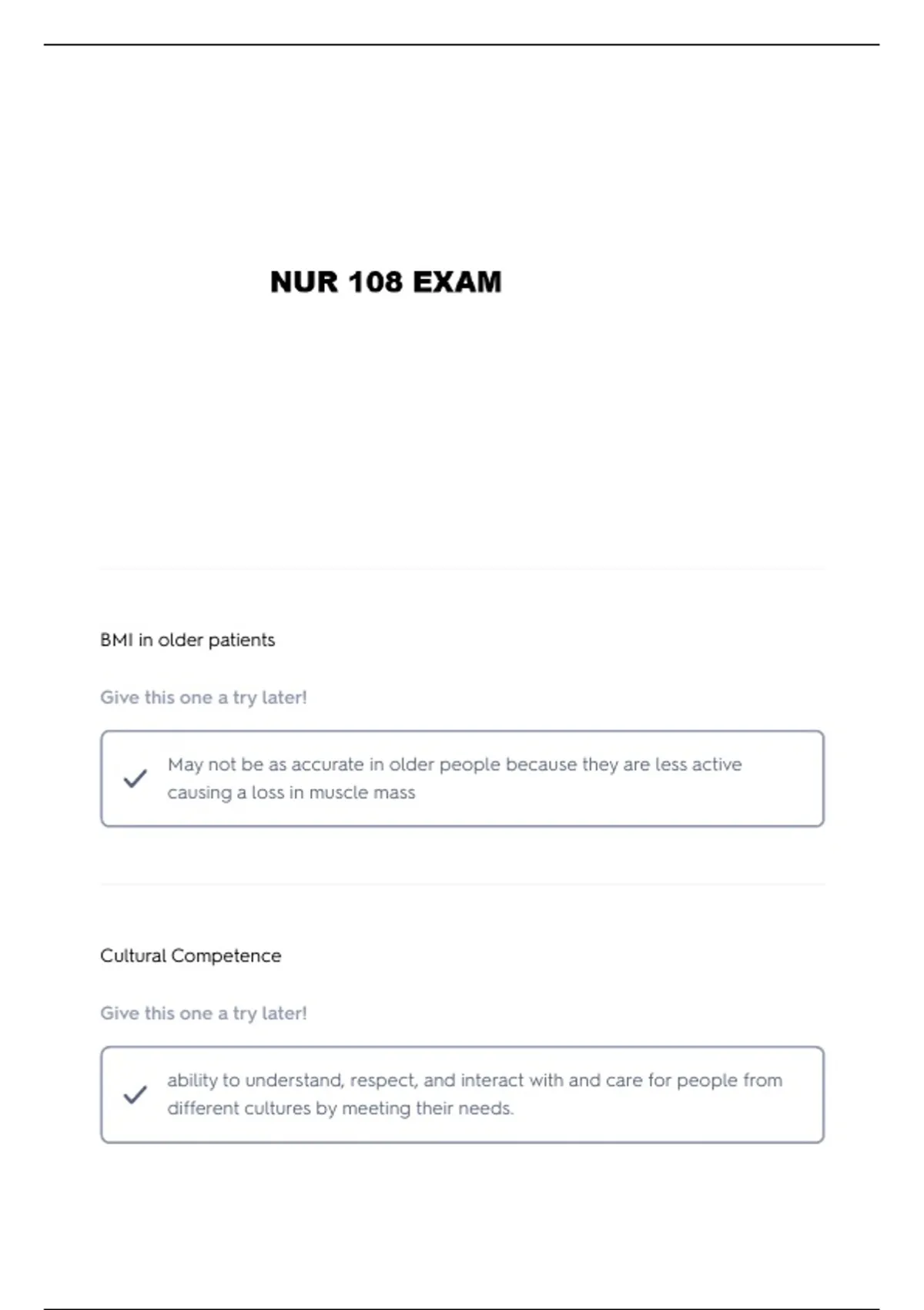 This document includes Exam 4 questions with verified answers for NUR 108 at John Wood Community College, focusing on foundational nursing concepts and patient-centered care. Topics covered include cultural competence, therapeutic communication, mental health, end-of-life care, gender identity, sleep disorders, compliance, and care of older adults. The question-and-answer format makes it well suited for exam preparation and concept review.