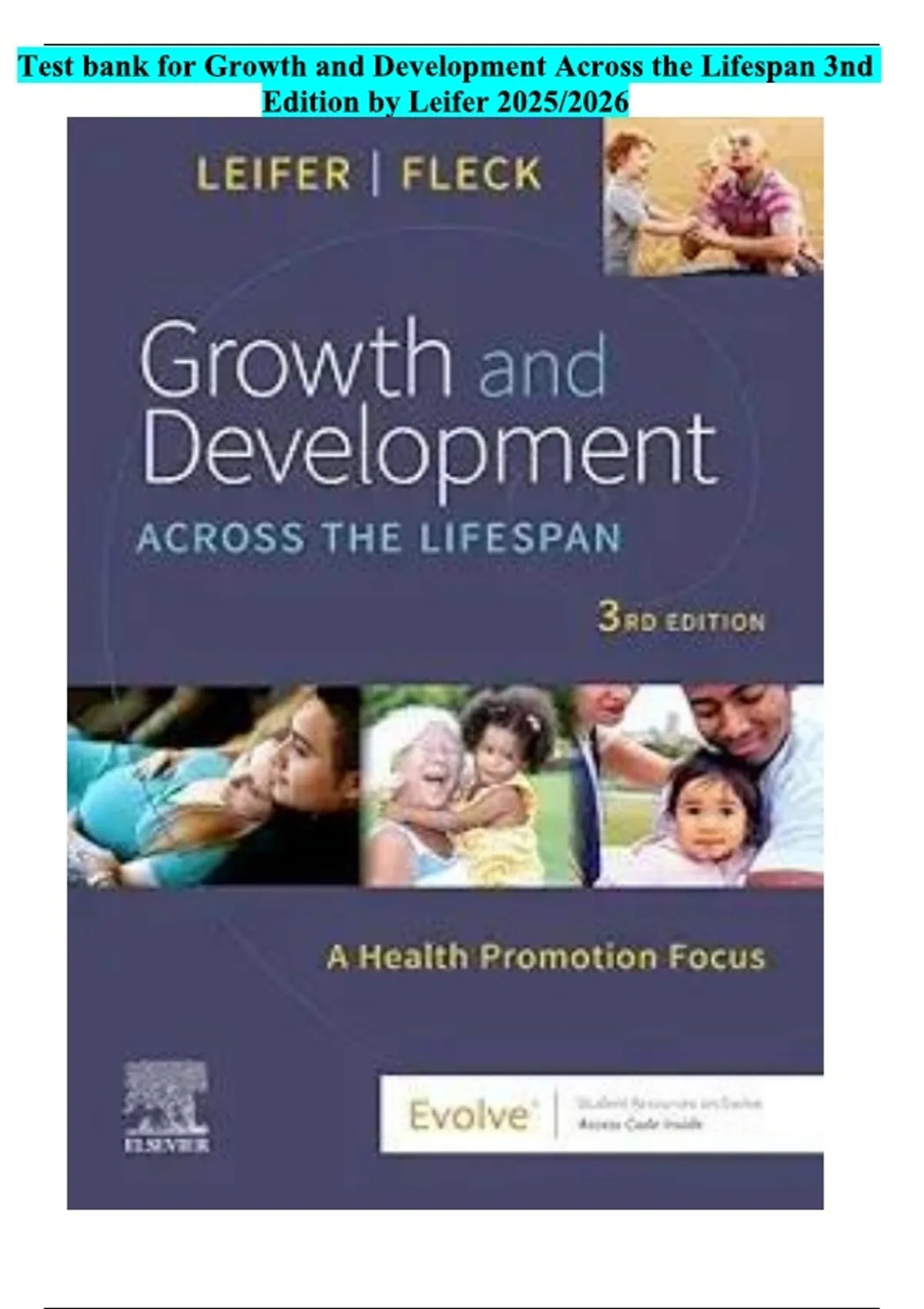 Test Bank For Growth and Development Across the Lifespan 3rd Edition By Gloria Leifer; Eve Fleck Chapters 1 - 16 Complete Table of Content Chapter 1 Healthy People 2020 Chapter 2 Government Influences on Health Care Chapter 3 Cultural Considerations in Health Care Chapter 4 The Influence of Family on Developing a Lifestyle Chapter 5 Theories of Development Chapter 6 Prenatal Influences on Healthy Development Chapter 7 The Infant Chapter 8 Early Childhood Chapter 9 Middle Childhood Chapter 10 Adolescence Chapter 11 Young Adulthood Chapter 12 Middle Adulthood Chapter 13 Late Adulthood Chapter 14 Advanced Old-Age and Geriatrics Chapter 15 Planning for the End of Life Chapter 16 Loss, Grief, and Bereavement Chapter 1: Healthy People 2020 Test Bank MULTIPLE CHOICE 1. The purpose of Healthy People 2020 is to: a. examine world health needs. b. evaluate accomplishments for years 2010–2020. c. focus primarily on infant health and mortality. d. examine funding issues for health care. ANSWER: B Healthy People 2020 is an evidence-based 10-year report card describing health-care accomplishments in the United States between the years of 2010 and 2020. DIF: Cognitive Level: Comprehension REF: p. 1 OBJ: 1 TOP: Healthy People 2020 KEY: Nursing Process Step: Intervention MSC: NCLEX: Health Promotion and Maintenance: prevention and early detection of disease 2. A health-care worker planning a research project related to teenage pregnancy in his community would include in the initial assessment the health status of the target population. Health status could be best evaluated by the examination of the: a. birth rate, disease morbidity, and life expectancy. b. birth rate, access to health care, and death rate. c. disease morbidity, life expectancy, and health insurance coverage. d. health insurance coverage, death rate, and access to health care. ANSWER: B Birth rate statistics identify age of mother; death rates include infant mortality and age of mother; access to health care may affect a teenager’s ability to obtain adequate prenatal care. DIF: Cognitive Level: Application REF: p. 6 OBJ: 3 TOP: Health status KEY: Nursing Process Step: Planning MSC: NCLEX: Health Promotion and Maintenance: prevention and early detection of disease 3. The health-care worker teaches a group of new parents about the “back to sleep” program, which is directed toward the reduction of sudden infant death syndrome (SIDS) by: a. positioning the baby on a small flat pillow. b. placing the baby on its back in the crib. c. gently rocking the baby before returning it to bed. d. tucking infant snuggly in the crib with a light blanket. ANSWER: B