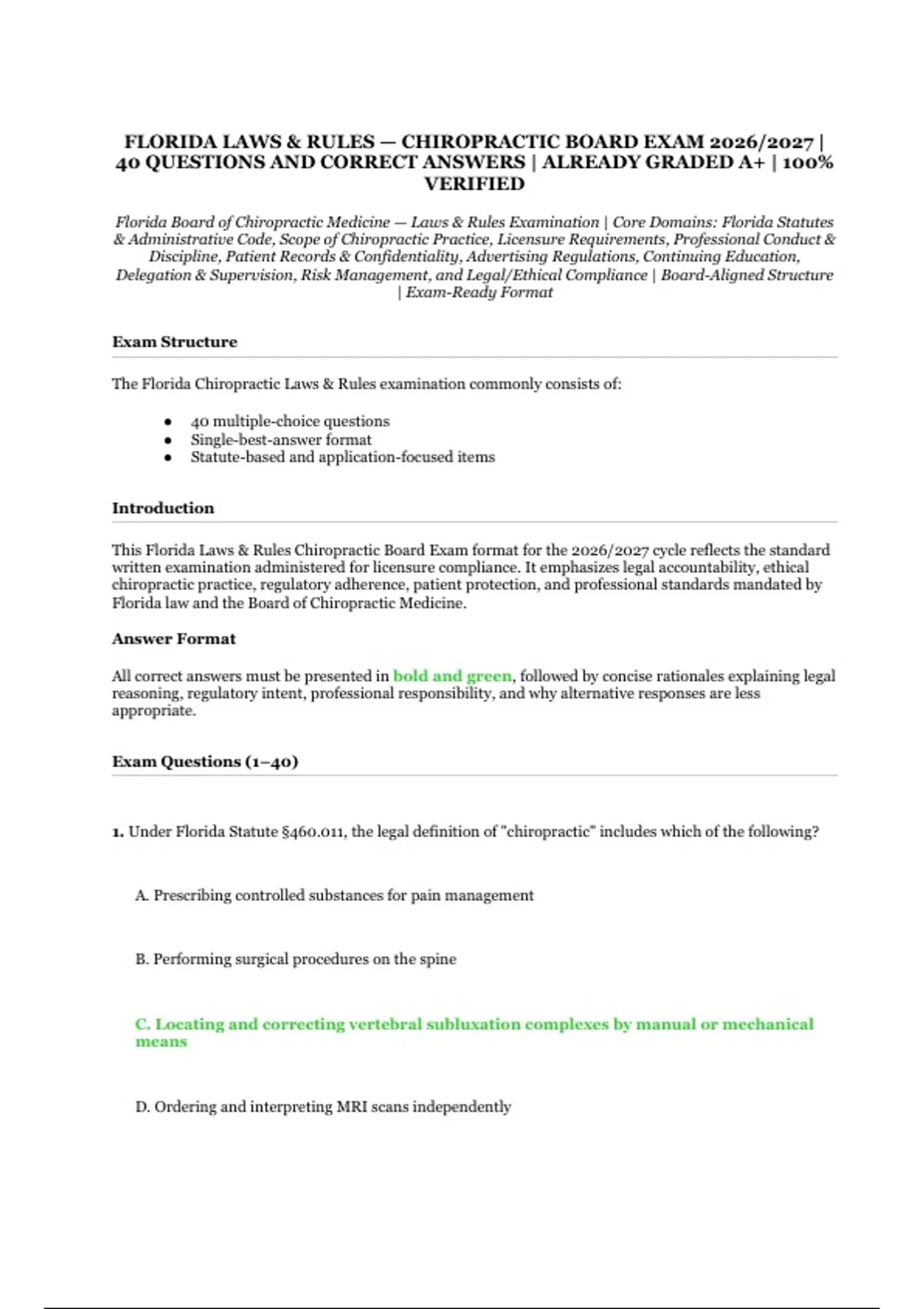This document provides comprehensive preparation for the Florida Board of Chiropractic Medicine Laws & Rules Examination, featuring 40 questions with correct answers already graded A+ and 100% verified for the 2026/2027 licensing cycle. It covers Florida statutes and administrative code, scope of chiropractic practice, licensure requirements, professional conduct and discipline, patient records and confidentiality, advertising regulations, continuing education, delegation and supervision, risk management, and legal/ethical compliance according to current state board standards and regulatory requirements. This essential tool offers authentic board exam simulation and systematic content review to ensure mastery of Florida chiropractic law principles and success on your state licensing assessment.