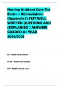 GRADED A+ YEAR 2024/2025 i x Exam (elaborations) • 5 pages • by hesisolver • uploaded 2024 Quick View i x Medical-Surgical Nursing Concepts for Interprofes • Medical-Surgical Nursing Concepts for Interprofes Nursing Assistant Care The Basics – Abbreviations (Appendix I) TEST WELL WRITTEN QUESTIONS AND (EXPLAINED ) ANSWERS GRADED A+ YEAR 2024/2025Nursing Assistant Care The Basics – Abbreviations (Appendix I) TEST WELL WRITTEN QUESTIONS AND (EXPLAINED ) (0) CA$52.36 0x sold Nursing Assistant Care The