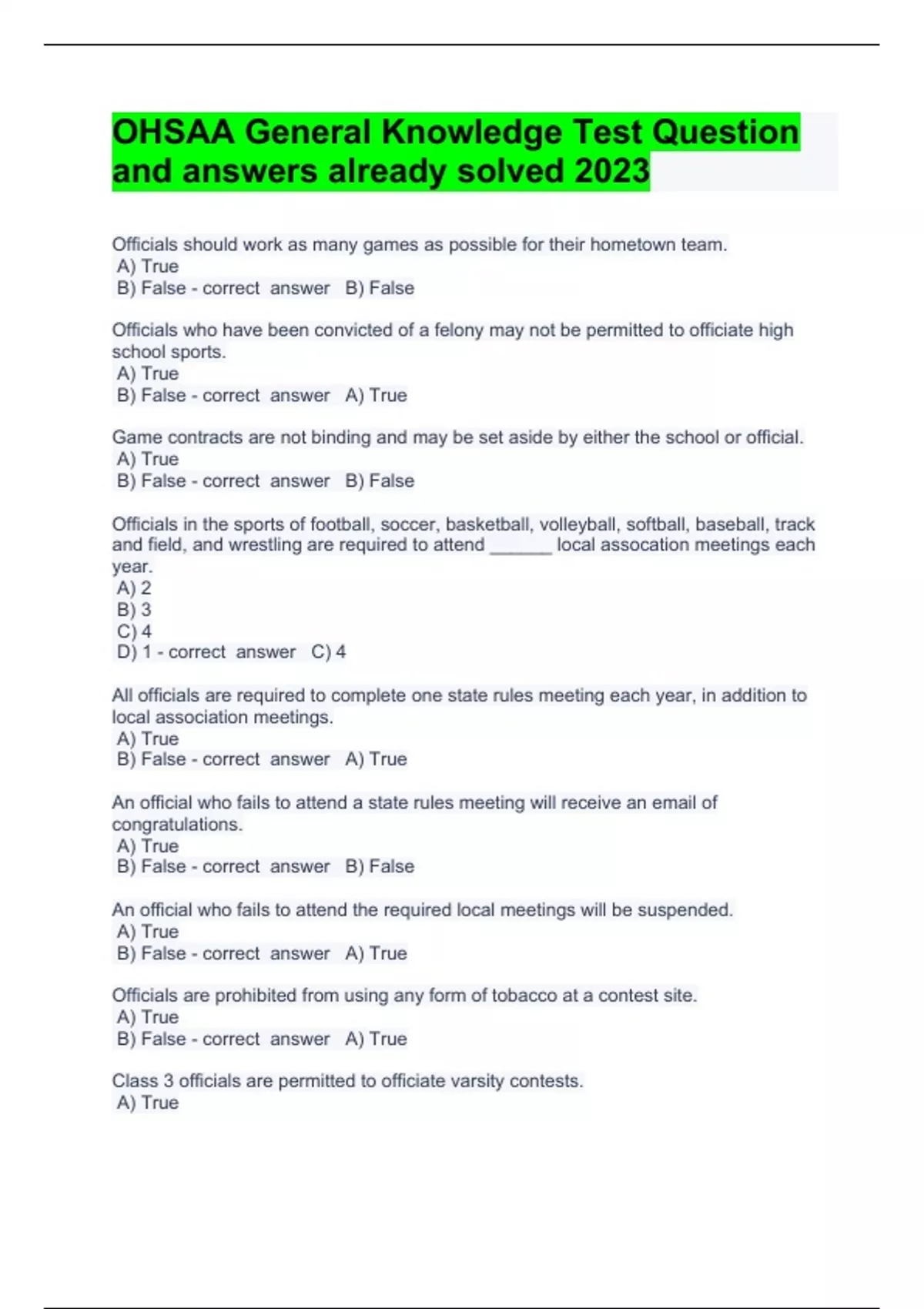 Sport Law Exam 6 Question with complete solution 2023 Exam (elaborations) 2019 Football Mechanics Exam(UPDATED) Questions and answers already solved Exam (elaborations) NFHS Basketball Rules Exam Part I Question and answers already passed 2023 Exam (elaborations) OHSAA 2023 Baseball Mechanics Exam Question and answers 100% correct Exam (ela